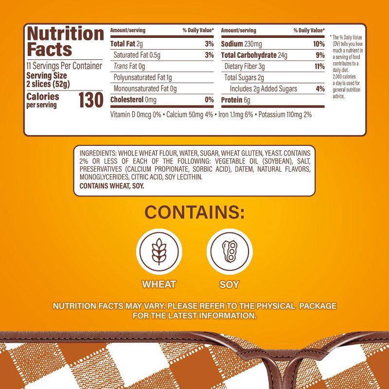 Whole Wheat Flour, Water, Sugar, Wheat Gluten, Yeast, Contains 2% or Less of Each of the Following: Vegetable Oil (Soybean), Salt, Preservatives (Calcium Propionate, Sorbic Acid), DATEM, Natural Flavo…