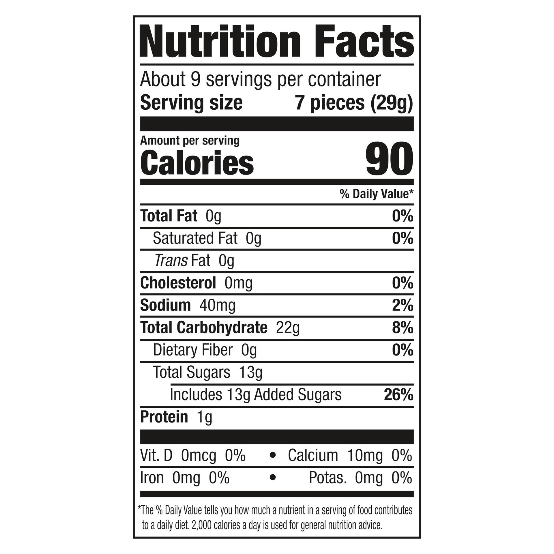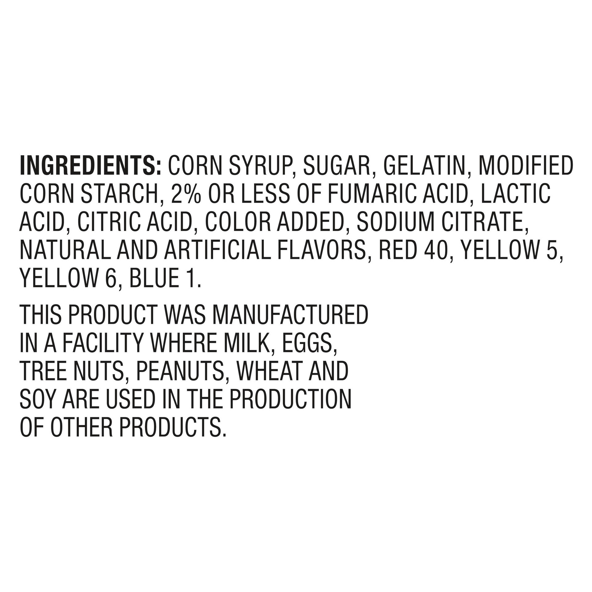 Corn Syrup, Sugar, Gelatin, Modified Food Starch (Corn), Fumaric Acid, Lactic Acid, Citric Acid, Sodium Citrate, Calcium Lactate, Sodium Lactate, Natural and Artificial Flavors, Titanium Dioxide (Colo…