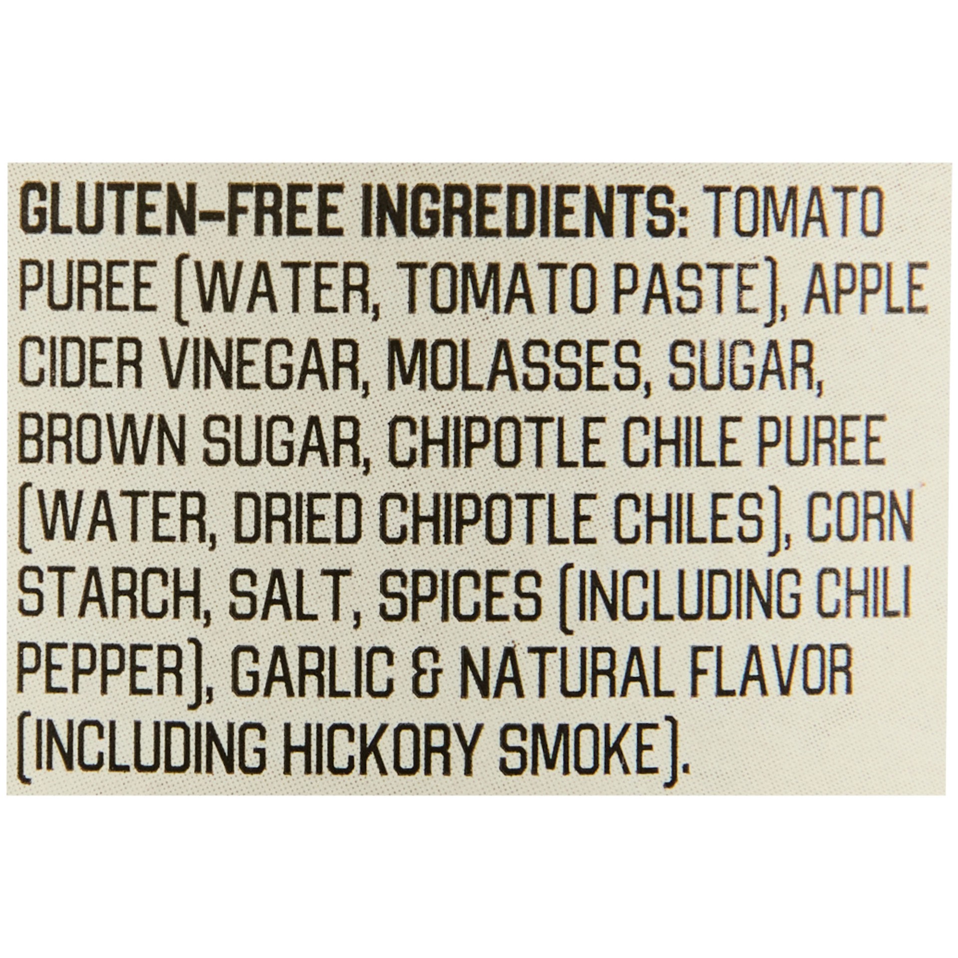 TOMATO PUREE (WATER, TOMATO PASTE), APPLE CIDER VINEGAR, MOLASSES, SUGAR, BROWN SUGAR, CHIPOTLE CHILE PUREE WATER, DRIED CHIPOTLE CHILES), CORN STARCH, SALT, SPICES (INCLUDING CHILI PEPPER), GARLIC &a…
