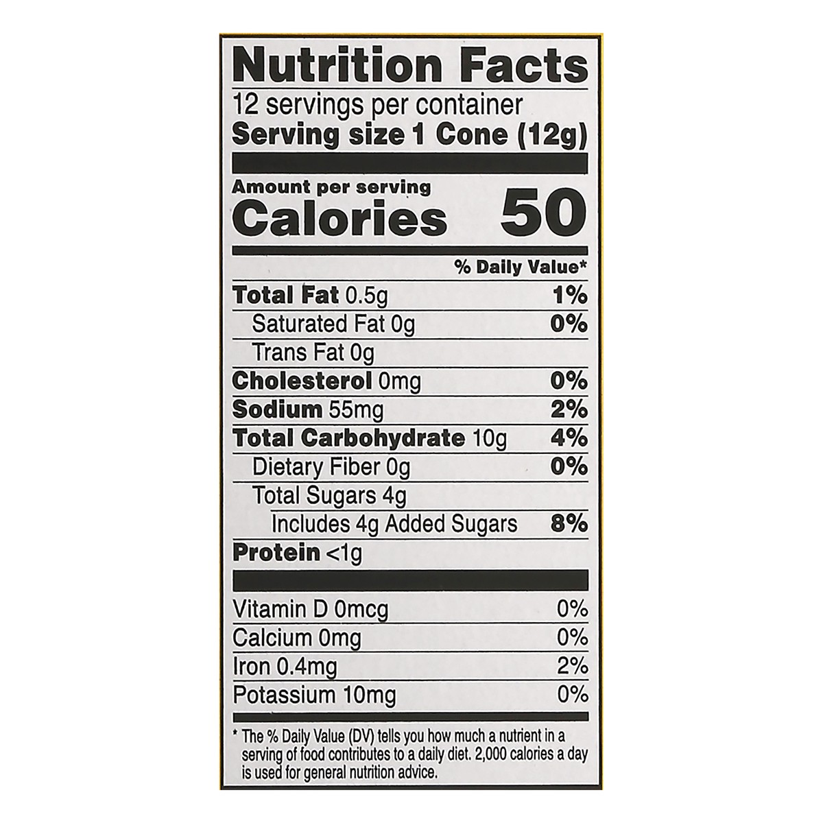 Per Cone: 50 calories; 0 g sat fat (0% DV); 55 mg sodium (2% DV); 4 g total sugars. how2recycle.info Questions or comments? Visit keebler.com; Call: 1-877-453-5837. Provide production code on package.…