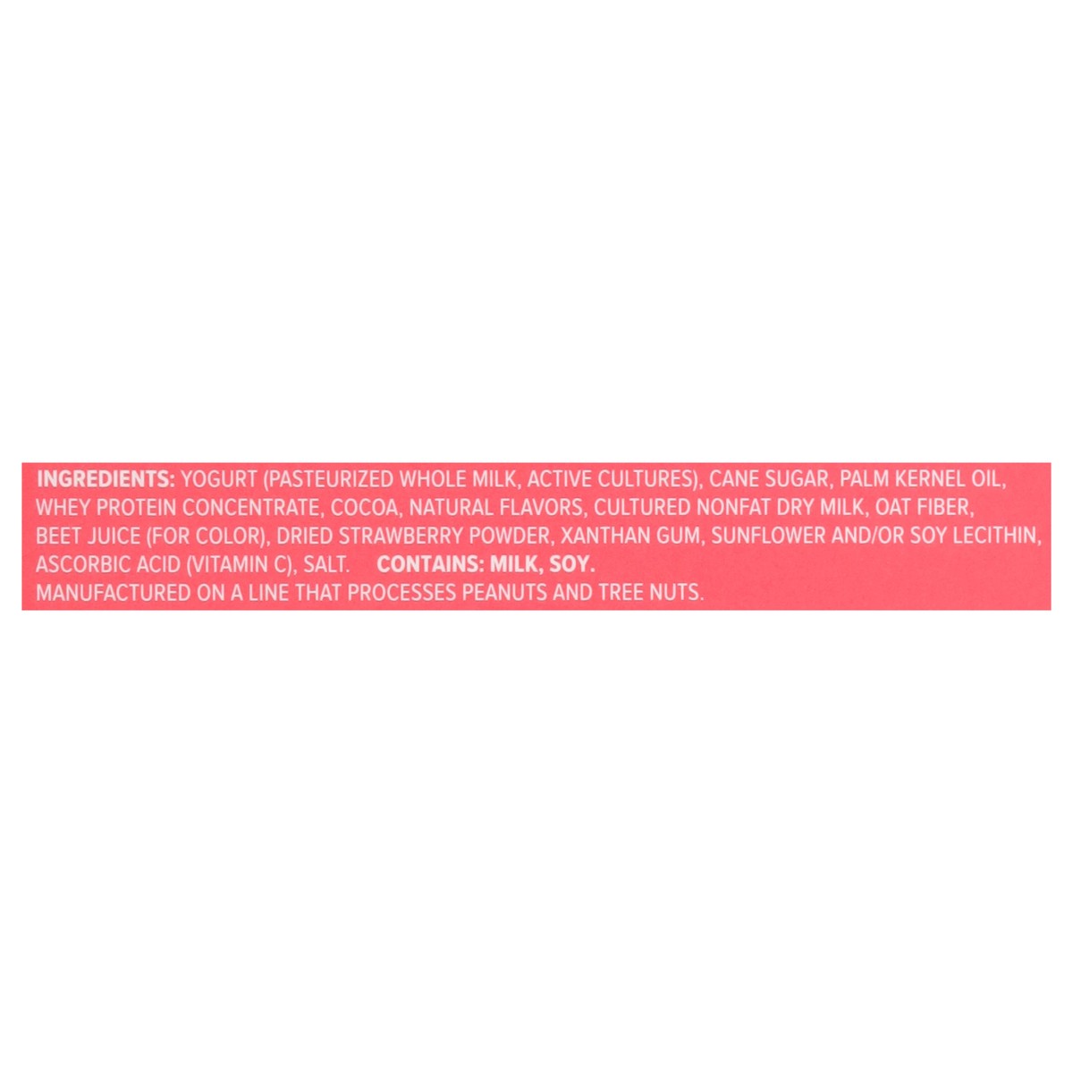 Yogurt (Pasteurized Whole Milk, Active Cultures), Cane Sugar, Palm Kernel Oil, Whey Protein Concentrate, Cocoa, Natural Flavors, Cultured Nonfat Dry Milk, Oat Fiber, Beet Juice (for Color), Dried Stra…