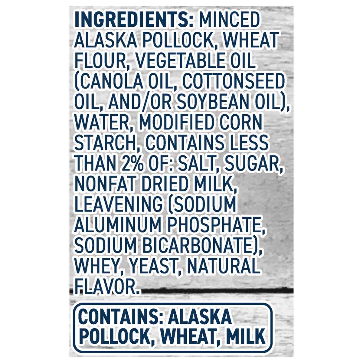 Minced Alaska Pollock, Wheat Flour, Vegetable Oil (Canola Oil, Cottonseed Oil, and/or Soybean Oil), Water, Modified Corn Starch, Contains Less than 2% of: Salt, Sugar, Nonfat Dried Milk, Leavening (So…