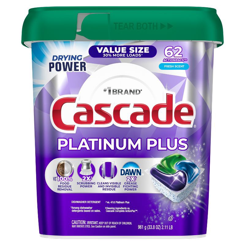 New and Improved Cascade Platinum Plus ActionPacs dishwasher detergent gives your dishes a breakthrough clean with up to 100% food residue removal. Loaded with 2X* the Dawn grease fighting power, and …