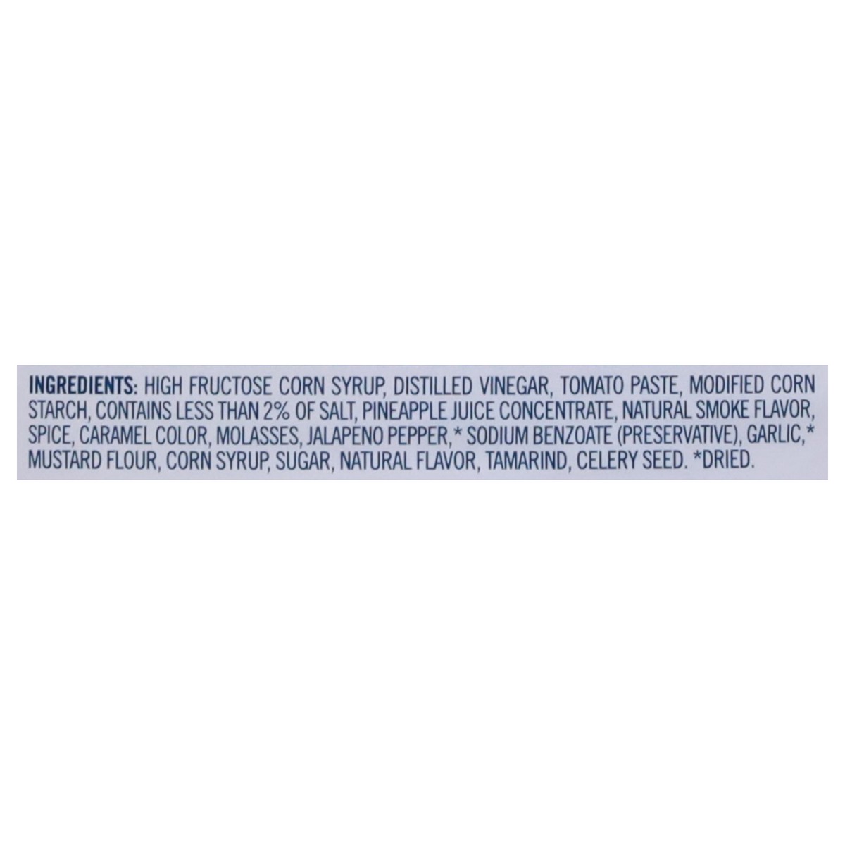 High Fructose Corn Syrup, Distilled Vinegar, Tomato Paste, Modified Corn Starch, Contains Less than 2% of Salt, Pineapple Juice Concentrate, Natural Smoke Flavor, Spice, Caramel Color, Molasses, Jalap…
