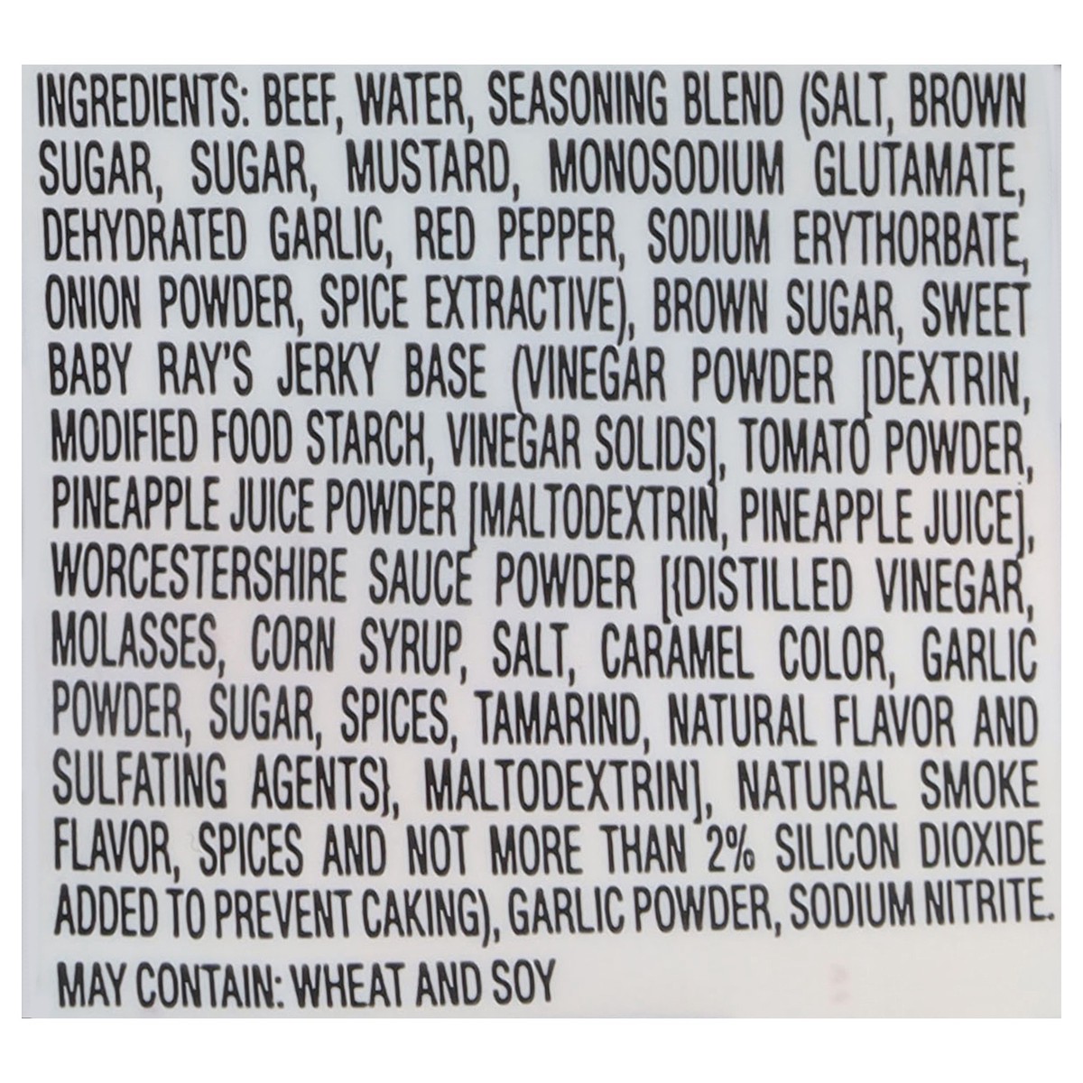 Beef, Water, Seasoning Blend (Salt, Brown Sugar, Sugar, Mustard, Monosodium Glutamate, Dehydrated Garlic, Red Pepper, Sodium Erythorbate, Onion Powder, Spice Extractive), Brown Sugar, Sweet Baby Ray's…