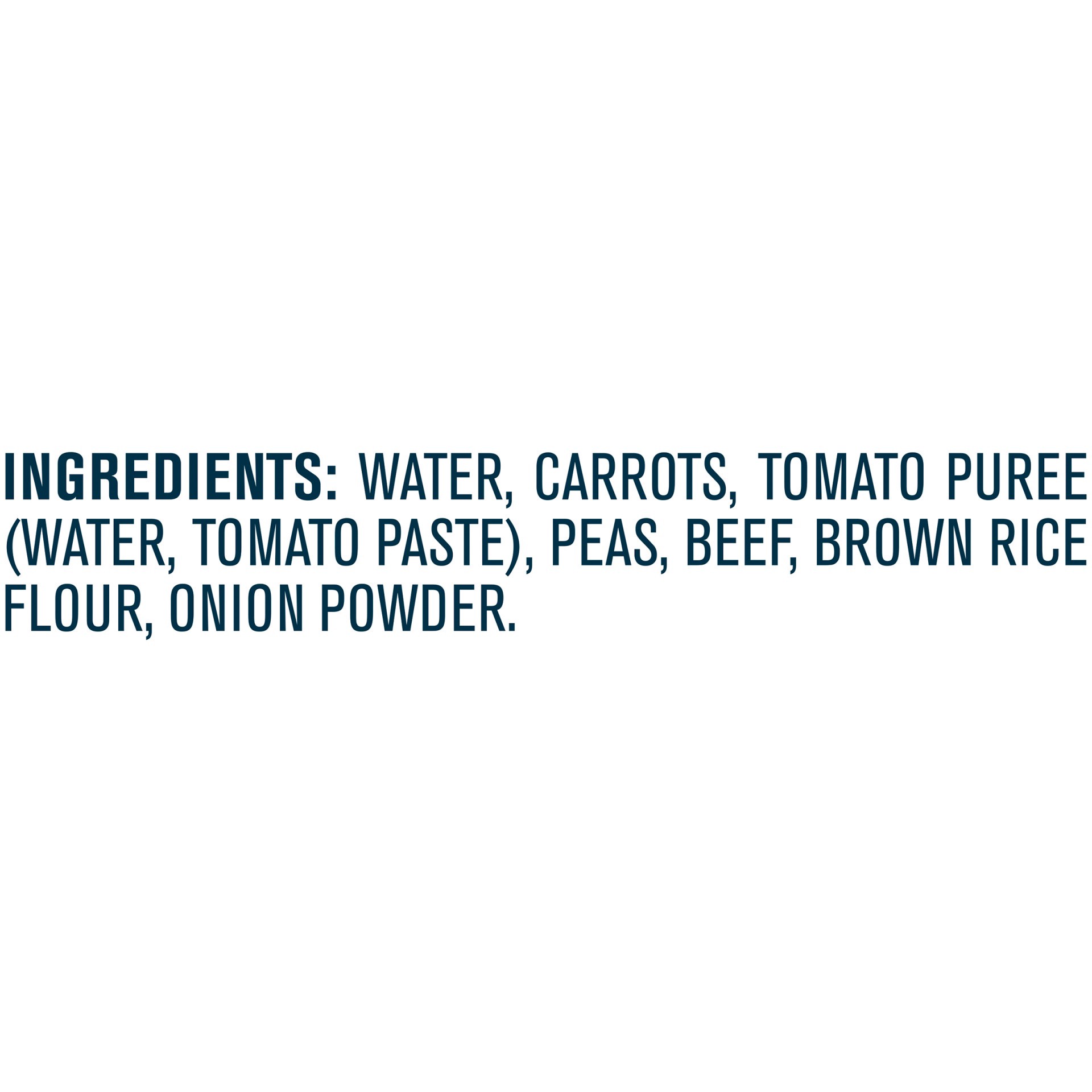 Water, Carrots, Peas, Tomato Puree (Water, Tomato Paste), Beef, Whole Grain Oat Flour, Onion Powder.