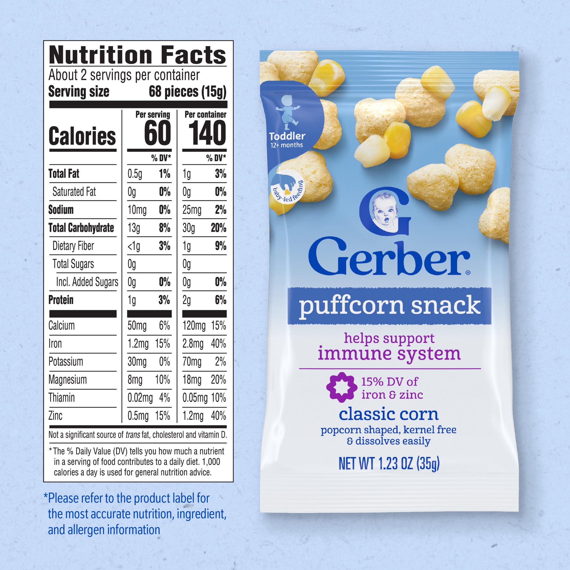 Gerber Classic Corn Puffcorn Toddler Snacks are made with wholesome ingredients and strict quality standards. They are kernel free, dissolve easily and are perfect for little hands learning to pick th…