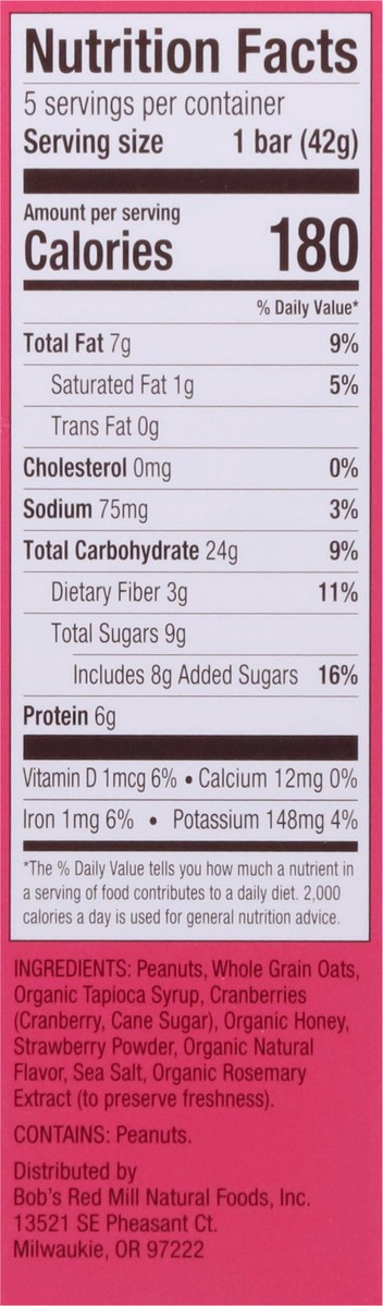 Peanuts, Whole Grain Oats, Organic Tapioca Syrup, Cranberries (Cranberry, Cane Sugar), Organic Honey, Strawberry Powder, Organic Natural Flavor, Sea Salt, Organic Rosemary Extract (to Preserve Freshne…