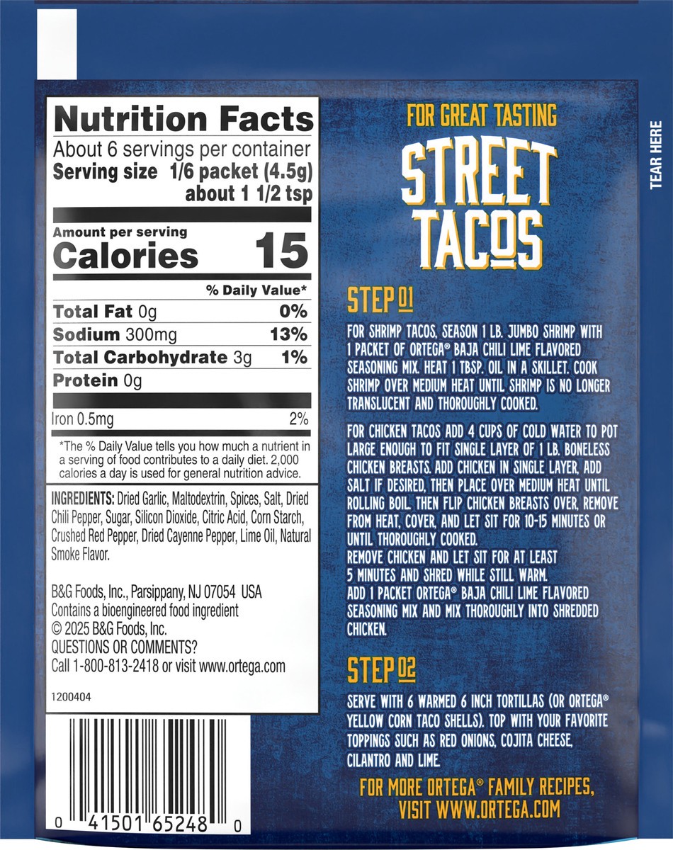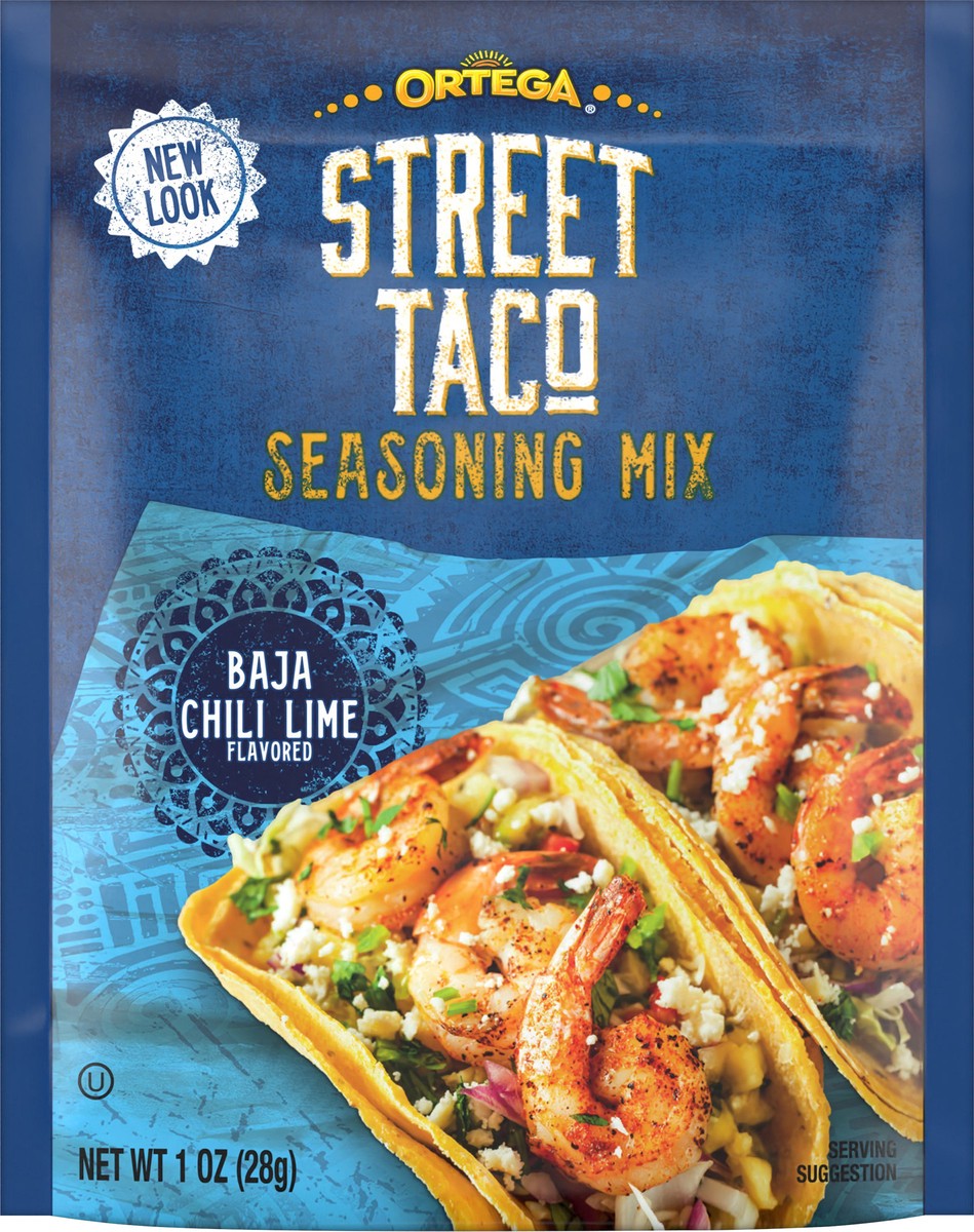 - One 1 ounce packet of Ortega Street Taco Baja Chili Lime Seasoning Mix