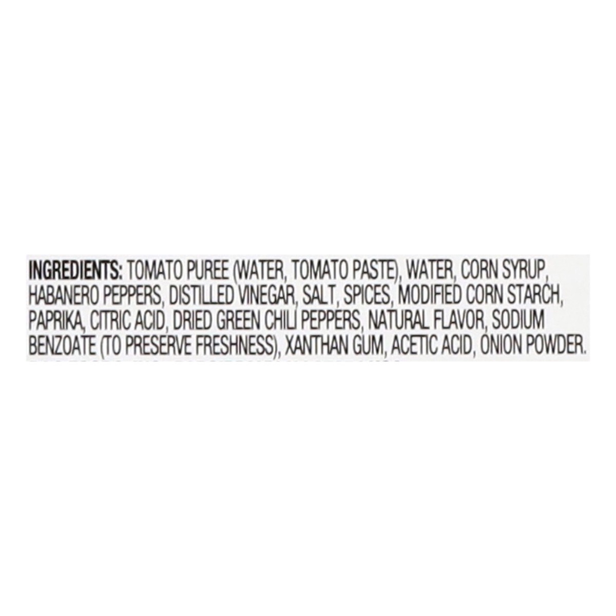 Tomato Puree (Water, Tomato Paste), Water, Corn Syrup, Habanero Peppers, Distilled Vinegar, Salt, Spices, Modified Corn Starch, Paprika, Citric Acid, Dried Green Chili Peppers, Natural Flavor, Sodium …