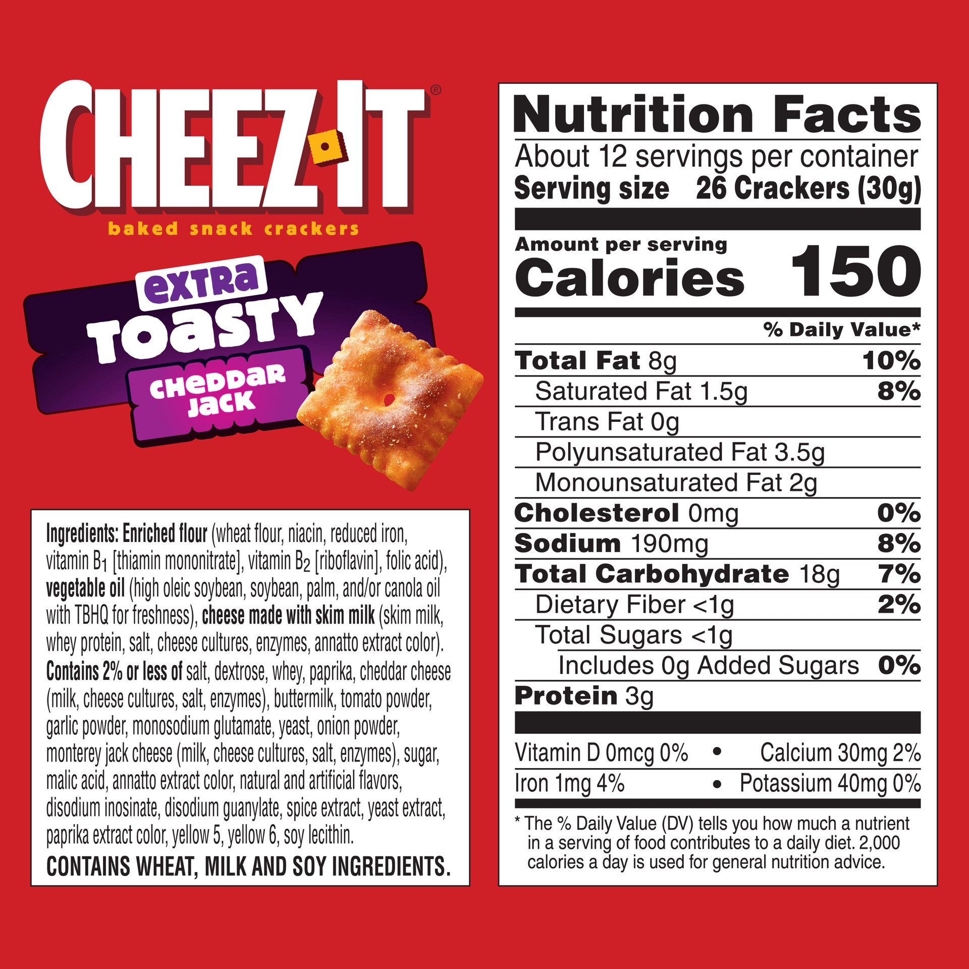 Make snack time more fun with Cheez-It Extra Toasty Cheddar Jack Baked Snack Crackers. Includes one, 12.4-ounce Cheez-It Extra Toasty Cheddar Jack Baked Snack Crackers box made with 100% real cheese a…