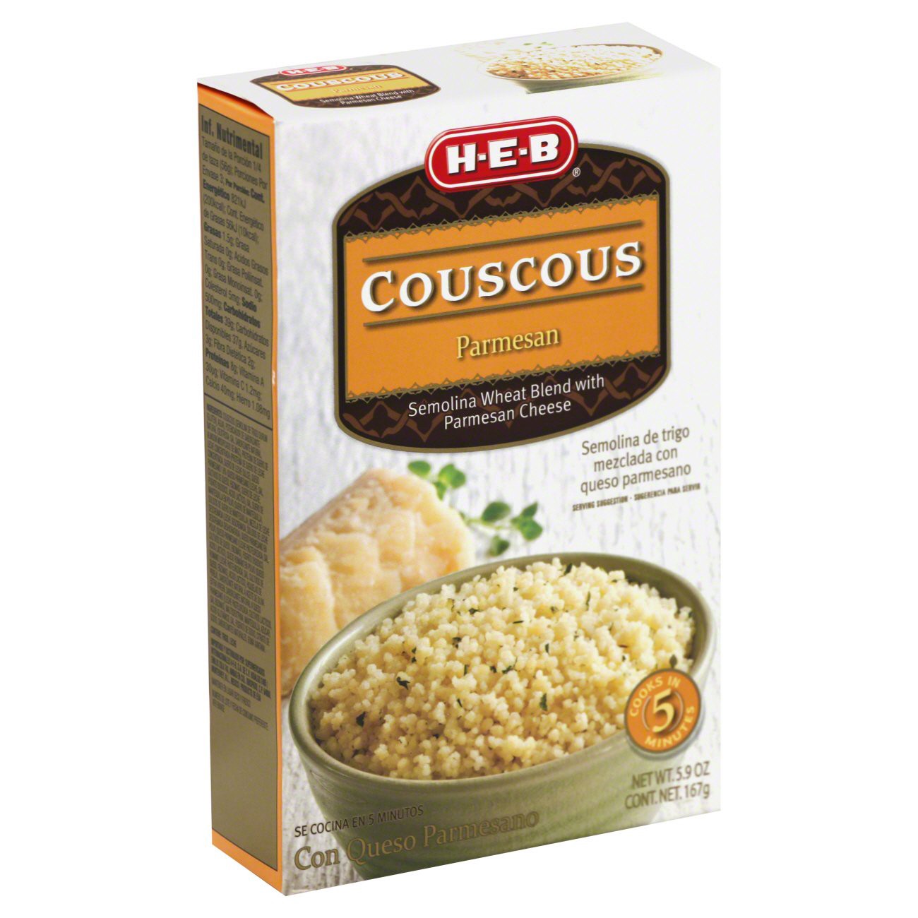 Our H-E-B Parmesan Couscous delivers a punch of Parmesan cheese flavor you can't help but love. Ready in 5 minutes, this is the perfect side dish when you're short on time but don't want to short on f…