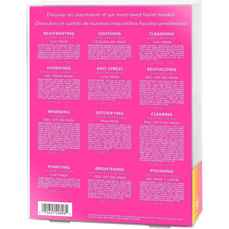 - Freeman Love to Mask Facial Mask Kit Includes: (1) Rejuventating Cucumber & Pink Salt Clay Mask, (1) Soothing Watermelon & Aloe Cooling Gel Mask, (1) Cleansing Apple Cider Vinegar Clay Mask, (1) Hydrating Glacier Water & Pink Peony Gel Cream Mask, (1) Anti-Stress Dead Sea Minerals Clay Mask, (1) Revitalizing Pomegranate Peel-Off Gel Mask, (1) Renewing Cucumber Peel-Off Gel Mask, (1) Detoxifying Charcoal & Black Sugar Mud Mas, (1) Clearing Sweet Tea & Lemon Peel-Off Clay Mask, (1) Purifying Avocado & Oatmeal Clay Mask, (1) Brightening Green Tea & Orange Blossom Peel-Off Gel Mask, (1) Polishing Charcoal & Black Sugar Gel Mask & Scrub, (1) Silicone Face Buffer, and (1) headband