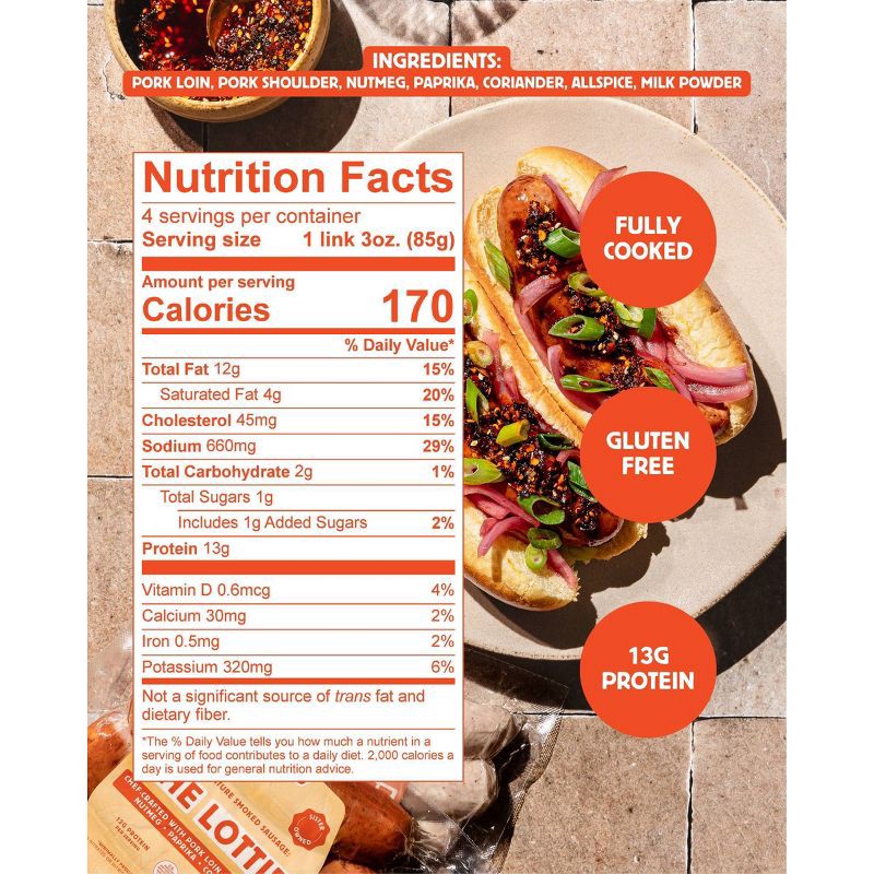 - Fully-cooked and made with pork loin and pork shoulder, nutmeg, paprika, and coriander