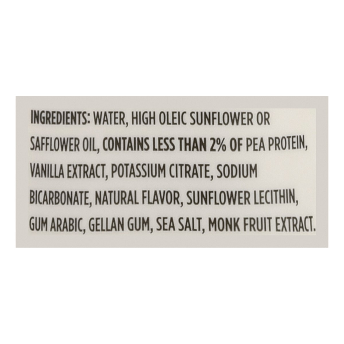 Water, High Oleic Sunflower or Safflower Oil, Contains Less than 2% of Pea Protein, Vanilla Extract, Potassium Citrate, Sodium Bicarbonate, Natural Flavor, Sunflower Lecithin, Gum Arabic, Gellan Gum, …