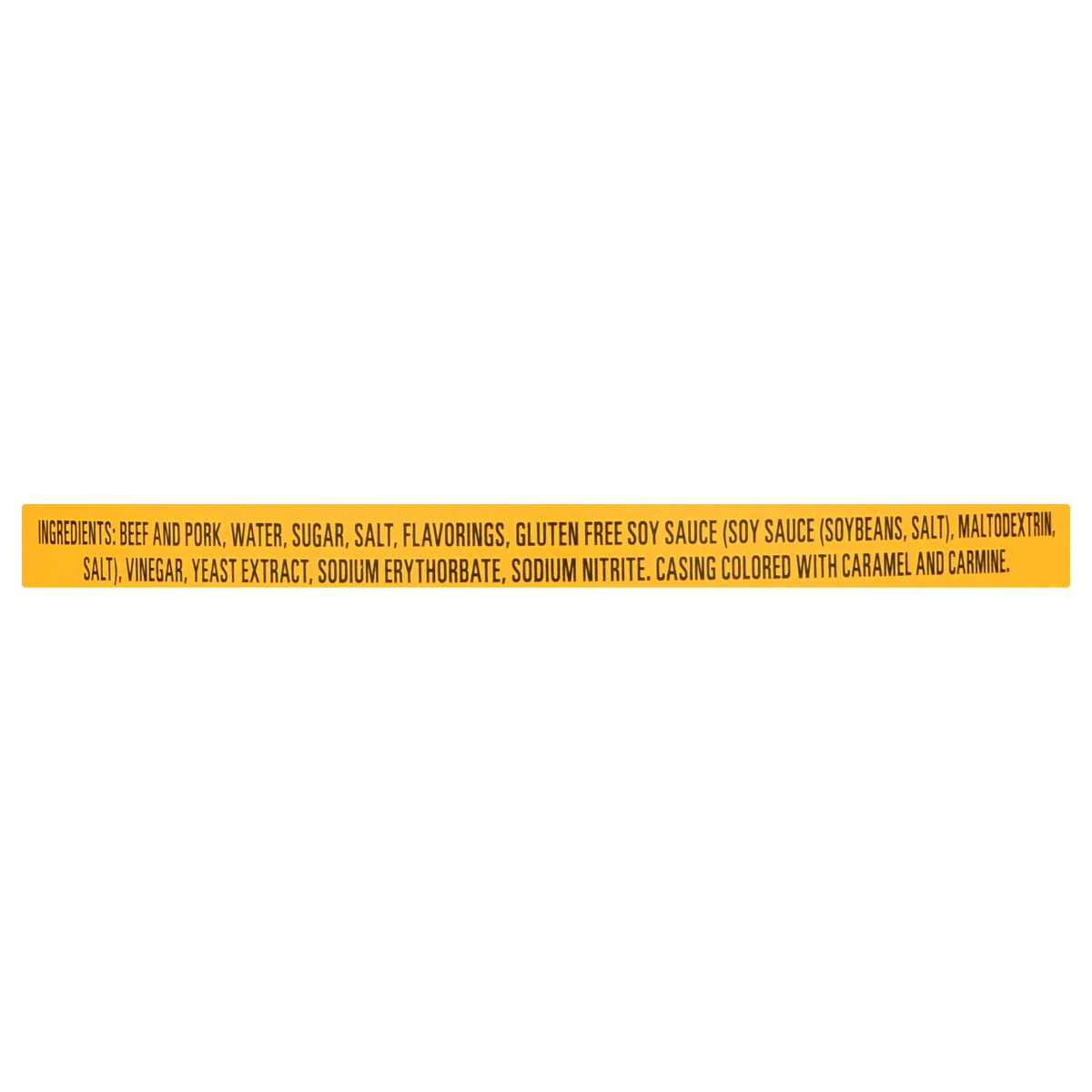 Beef and Pork, Water, Sugar, Salt, Flavorings, Gluten Free Soy Sauce (Soy Sauce (Soybeans, Salt), Maltodextrin, Salt), Vinegar, Yeast Extract, Sodium Erythorbate, Sodium Nitrite, Casing Colored with C…