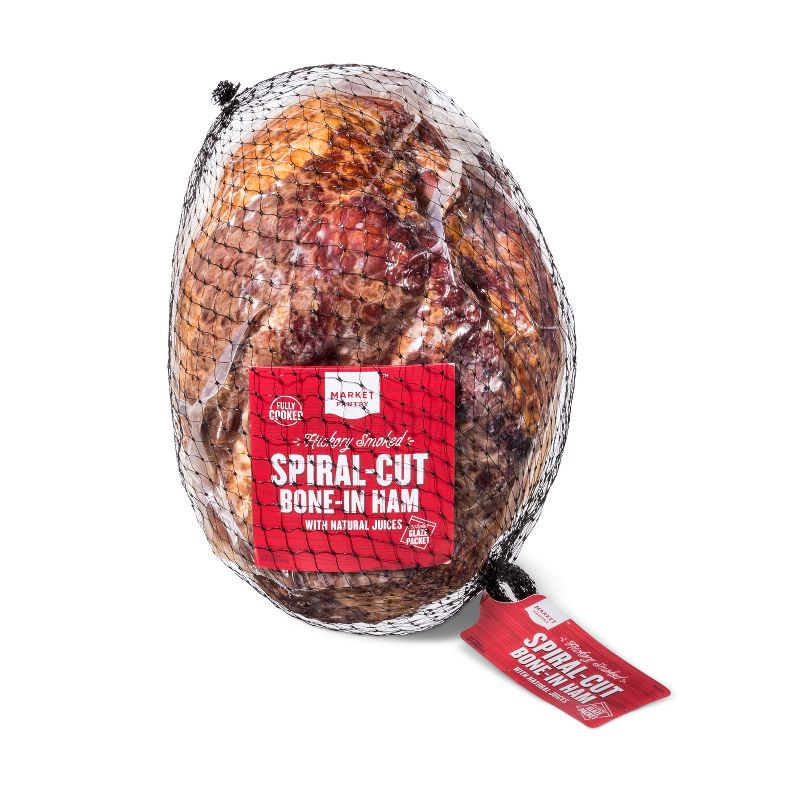 Get ready for the greatest holiday feast with ease when you have the Hickory Smoked Spiral-Cut Bone-In Ham from market pantry. This fully cooked ham includes a glaze packet so every bite is as delici…