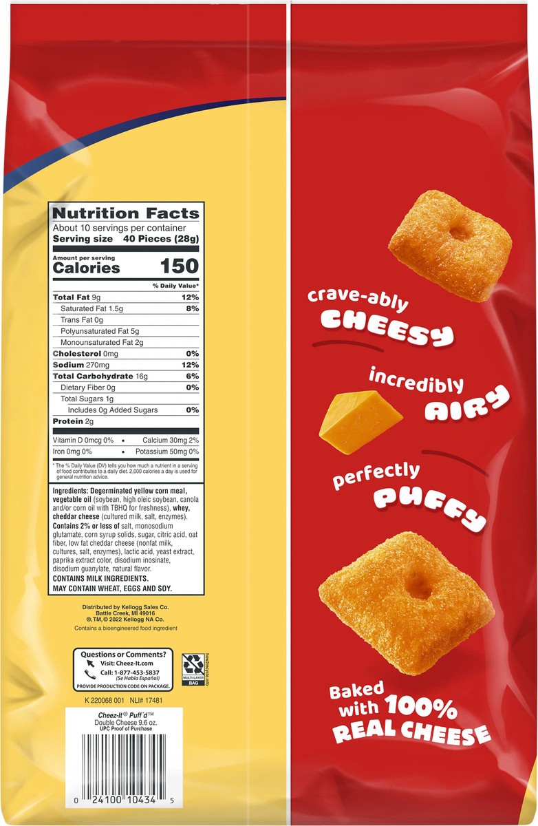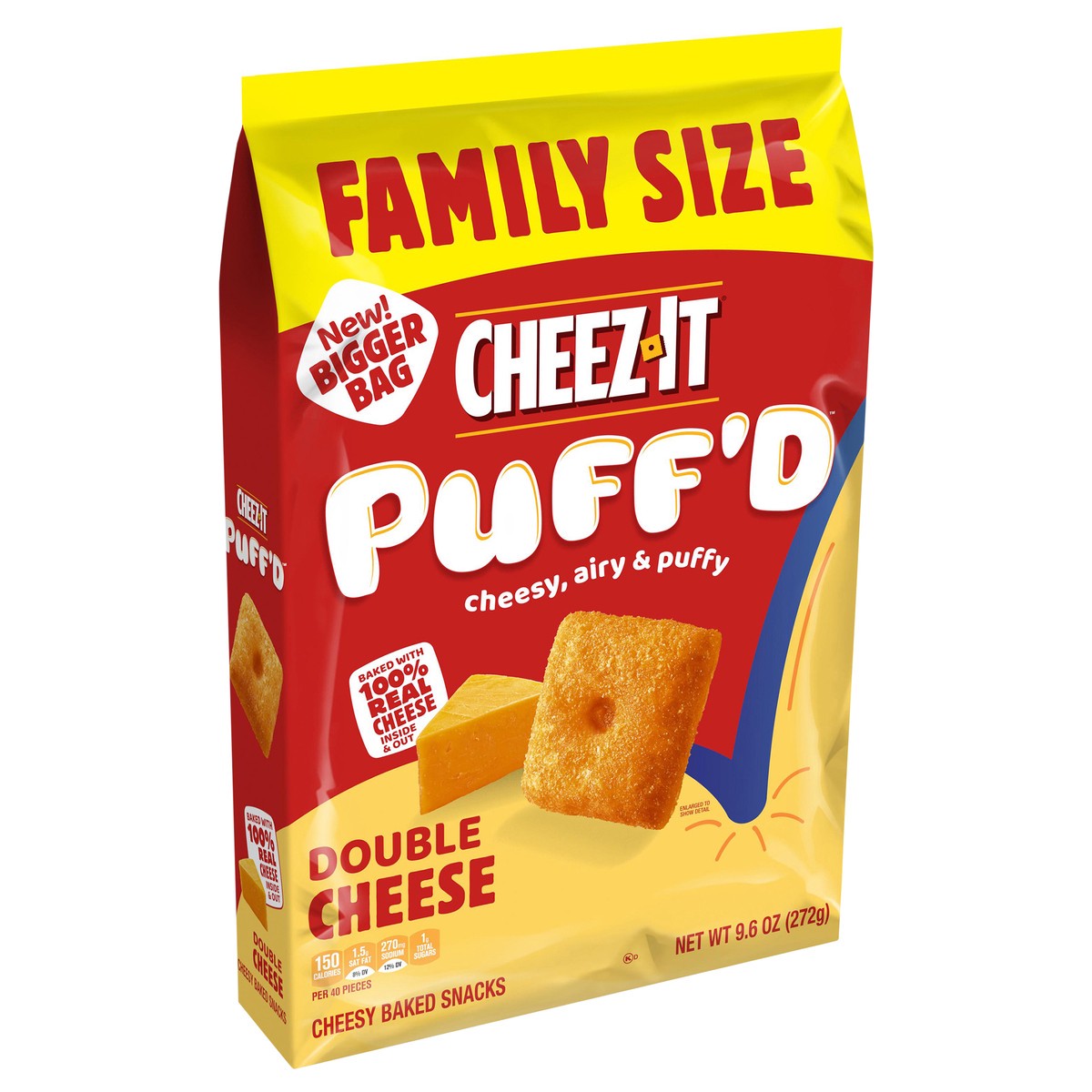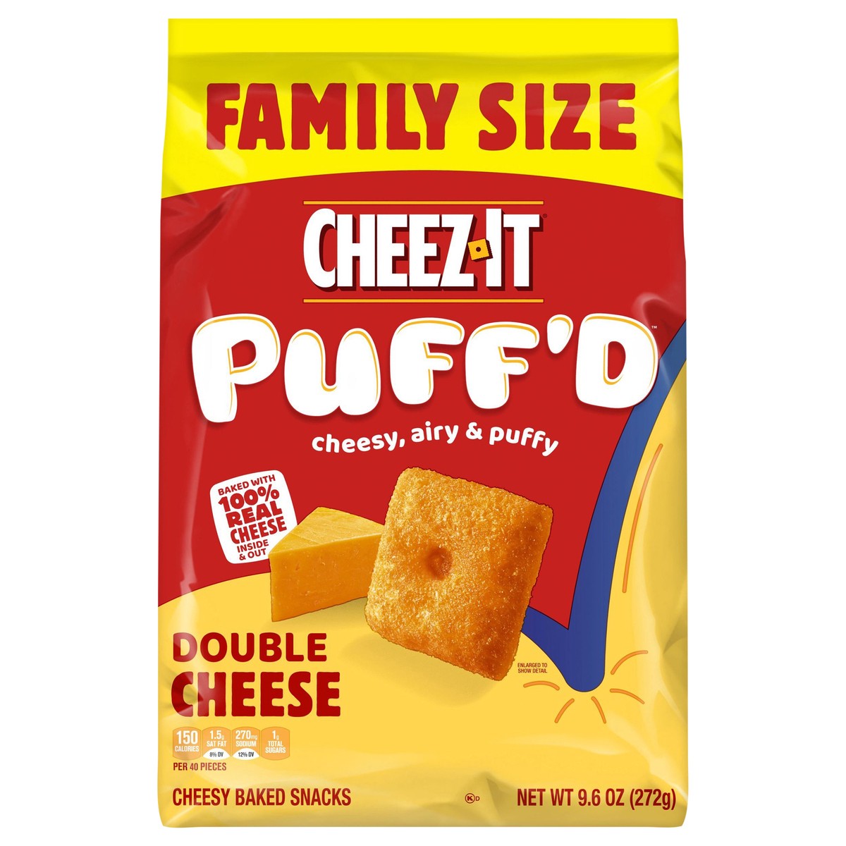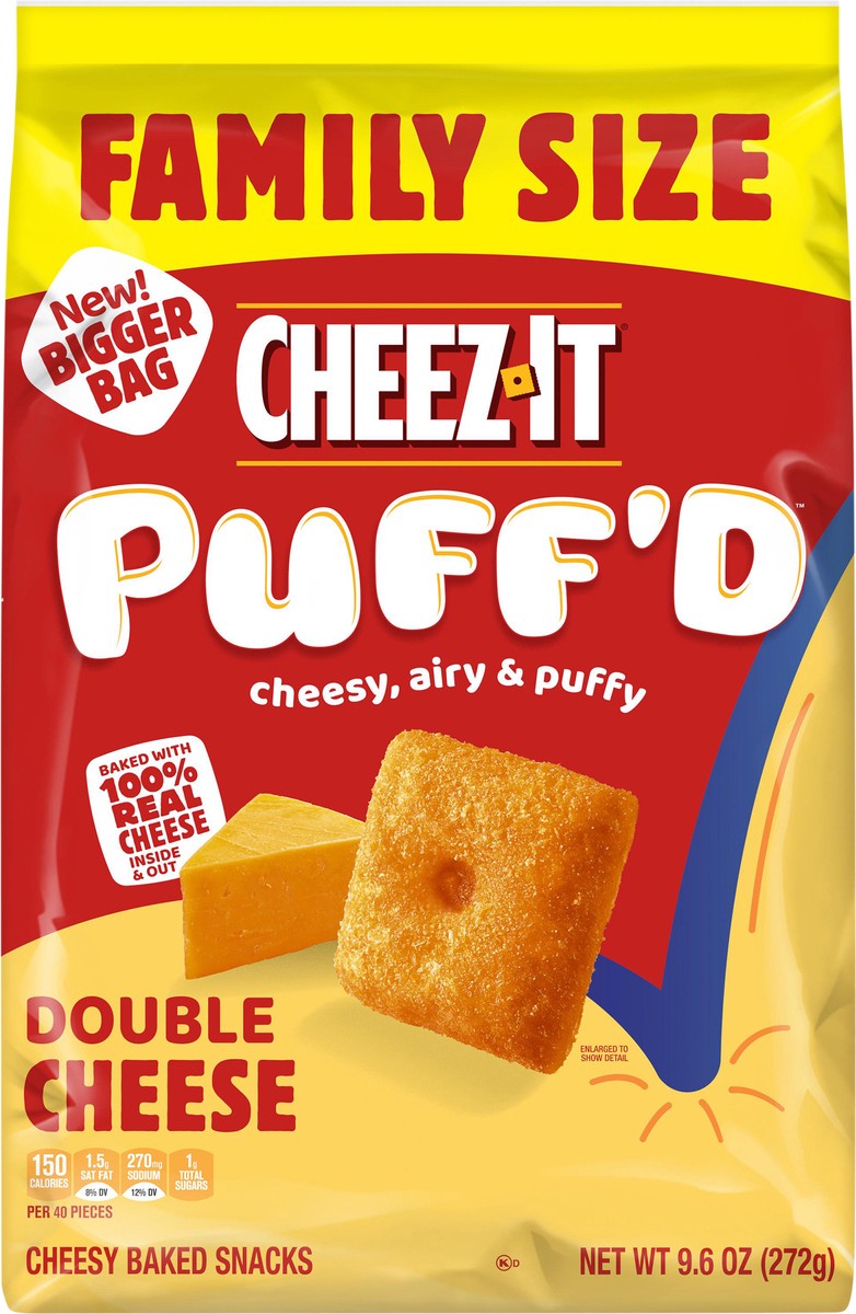 Taste the fun of puffy and airy, bite-sized squares baked with 100% real cheese inside and out. Includes one, 9.6-ounce bag of Cheez-It Puff''d Double Cheese Cheesy Baked Snacks. Double cheese means d…