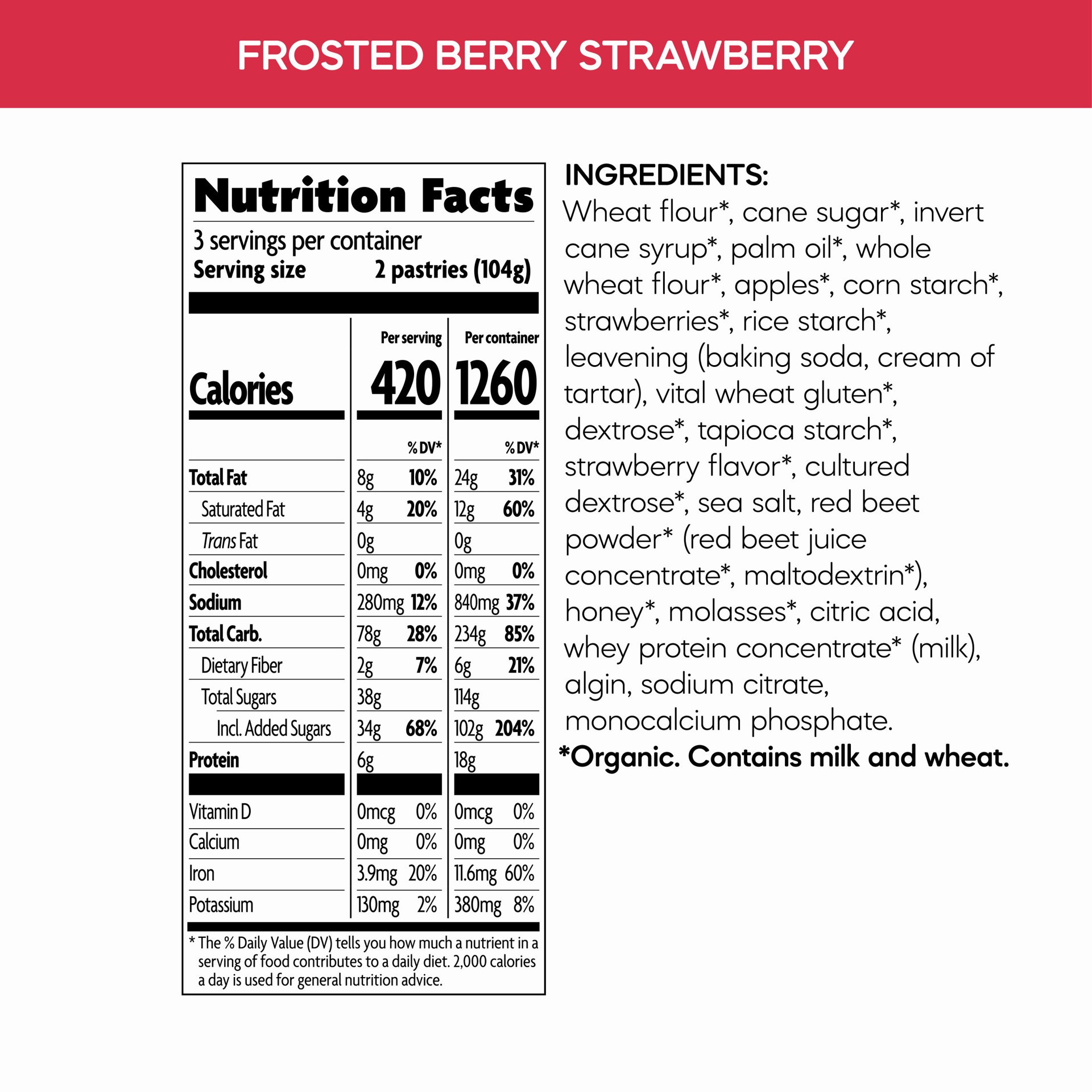 Nature's Path frosted strawberry organic toaster pastries contain a real strawberry fruit filling, encased in an organic pastry, and lightly frosted. You get 2 pastries per wrapper, 6 pastries per box…