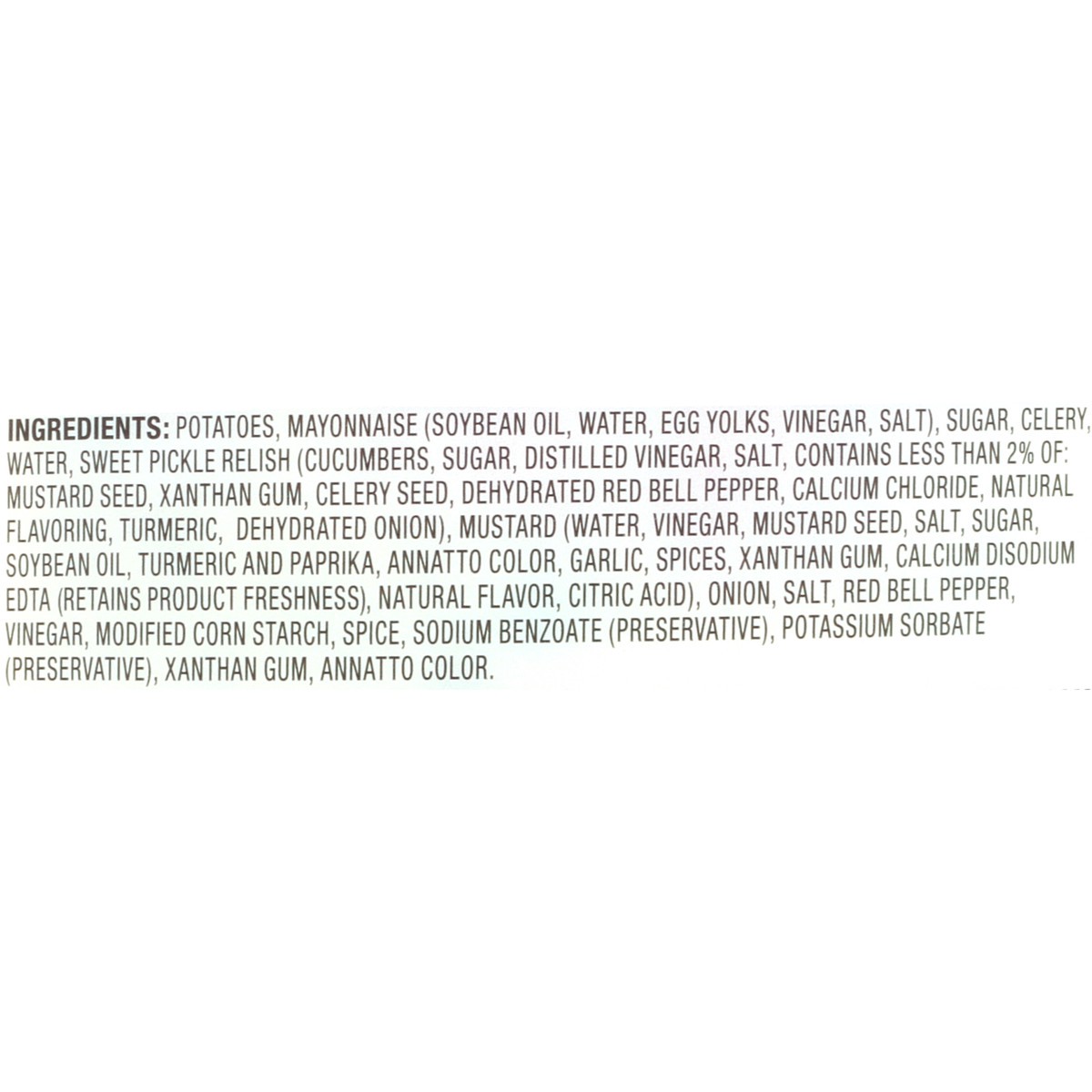 Potatoes, Mayonnaise (Soybean Oil, Water, Egg Yolks, Vinegar, Salt), Sugar, Celery, Water, Sweet Pickle Relish (Cucumbers, Sugar, Distilled Vinegar, Salt, Contains Less than 2% of: Mustard Seed, Xanth…