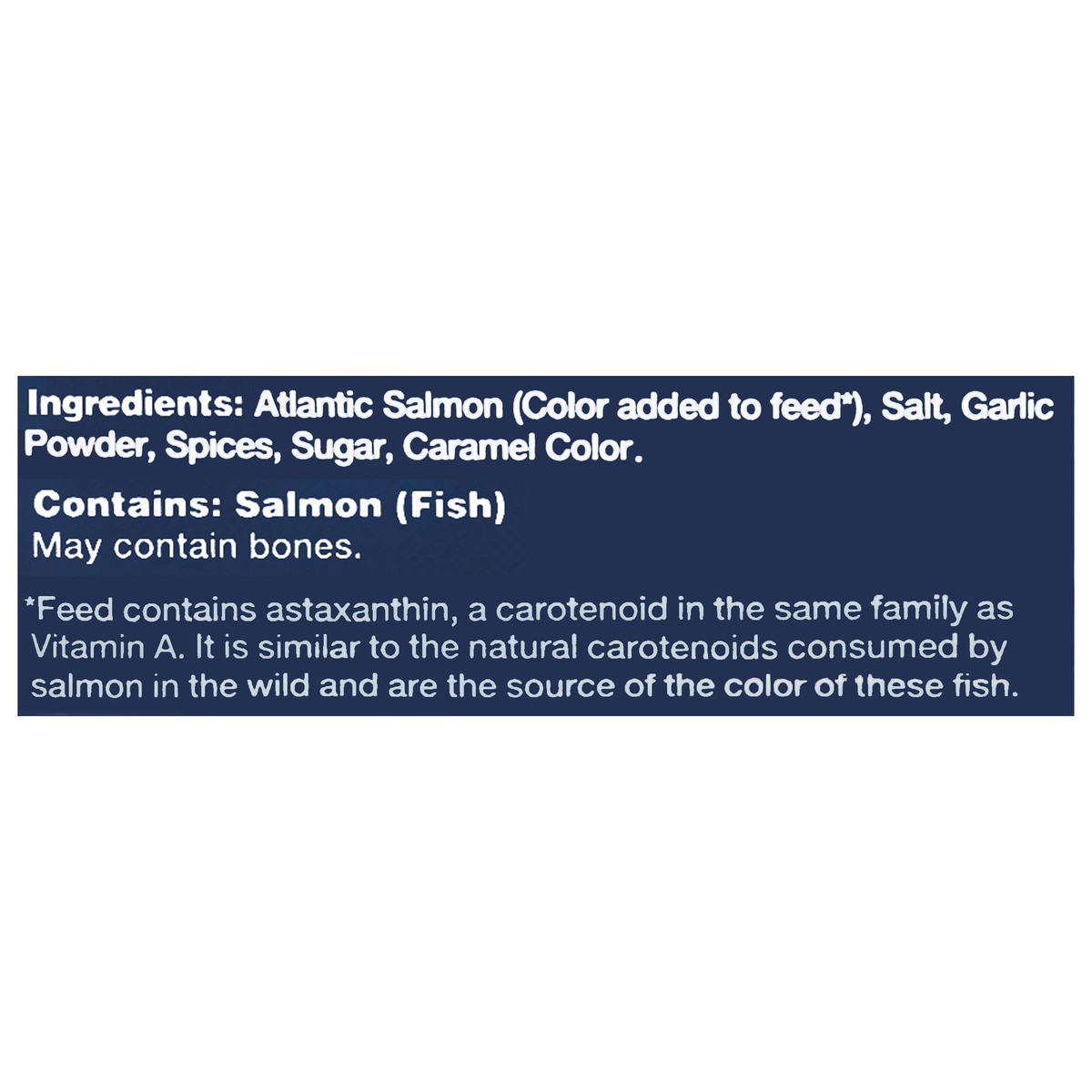 Atlantic Salmon (Color Added to Feed*), Salt, Garlic Powder, Spices, Sugar, Caramel Color. * Feed Contains Astaxanthin, a Carotenoid in the Same Family as Vitamin A. It is Similar to the Natural Carot…