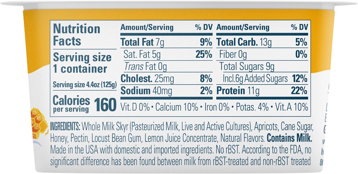 Whole Milk Skyr (Pasteurized Milk, Live and Active Cultures), Apricots, Cane Sugar, Honey, Pectin, Locust Bean Gum, Lemon Juice Concentrate, Natural Flavors. Live and Active Cultures: Including Heirlo…