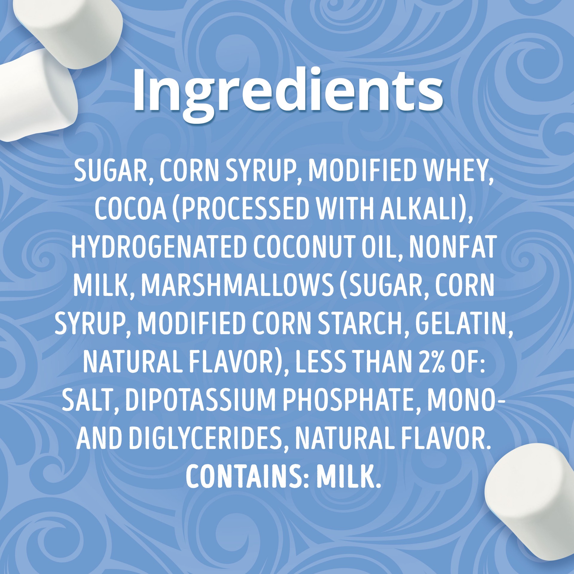 Sugar, Corn Syrup, Modified Whey, Cocoa (Processed with Alkali), Hydrogenated Coconut Oil, Nonfat Milk, Marshmallows (Sugar, Corn Syrup, Modified Corn Starch, Gelatin, Natural Flavor), Less Than 2% Of…