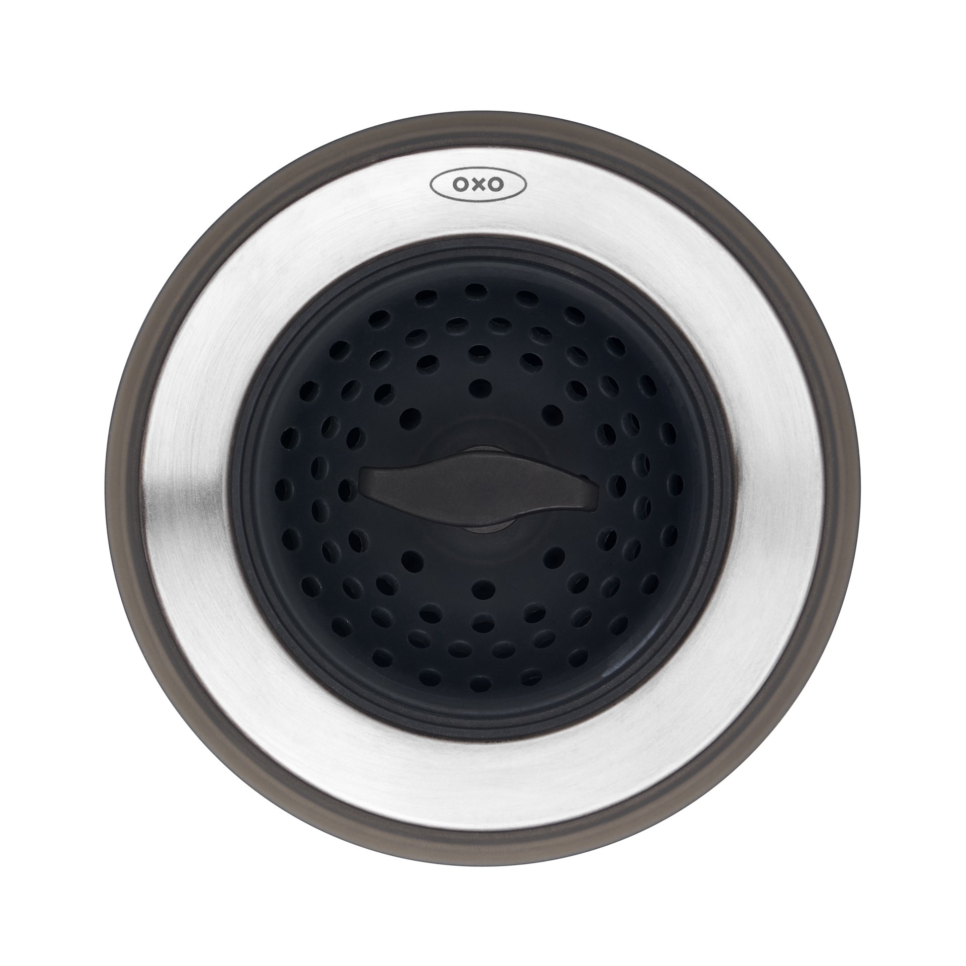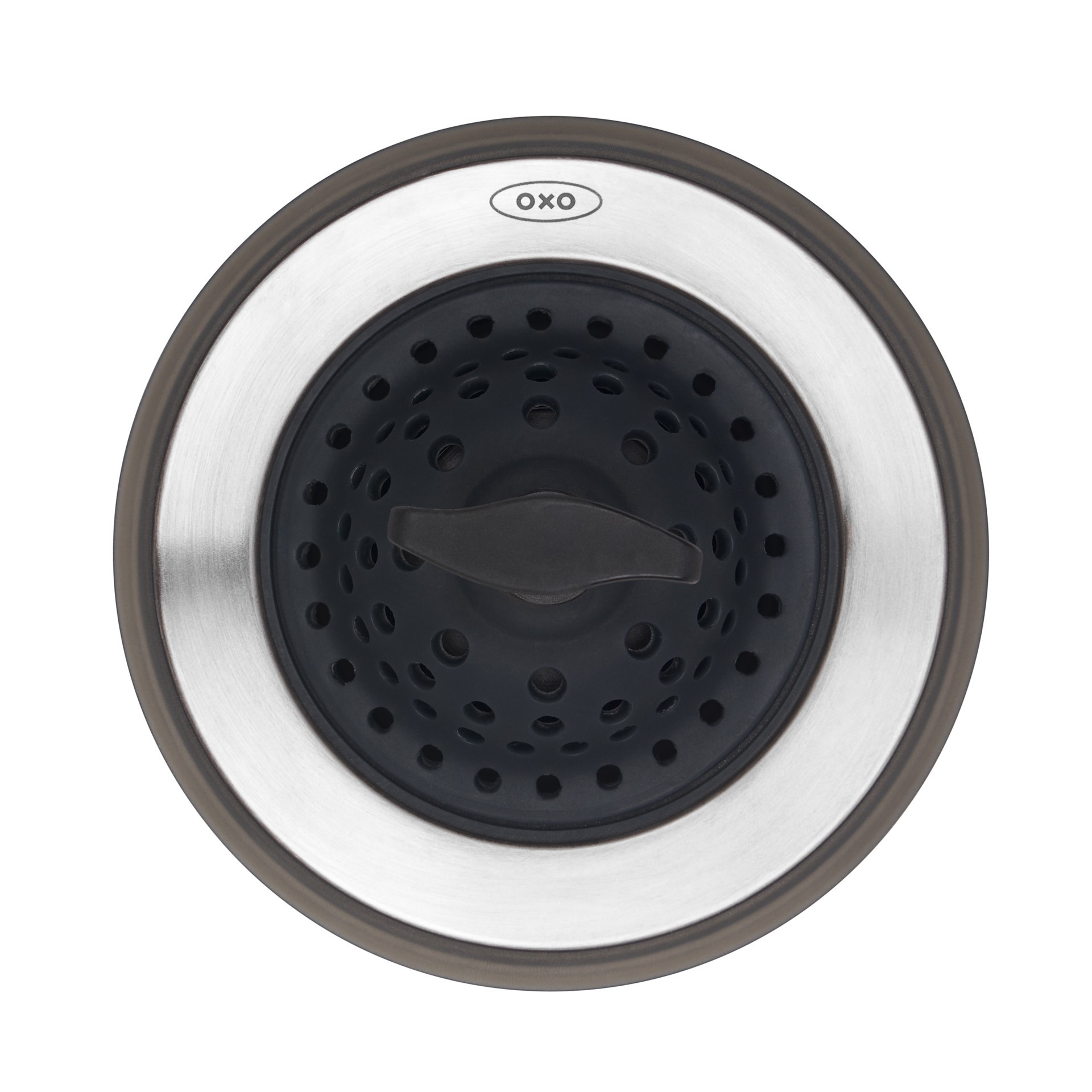 Easy-to-clean silicone strainer flips inside-out to empty. Stopper clicks into place and will not unintentionally fall and stop up the drain. Silicone under rim will not scratch sink. Dishwasher safe.