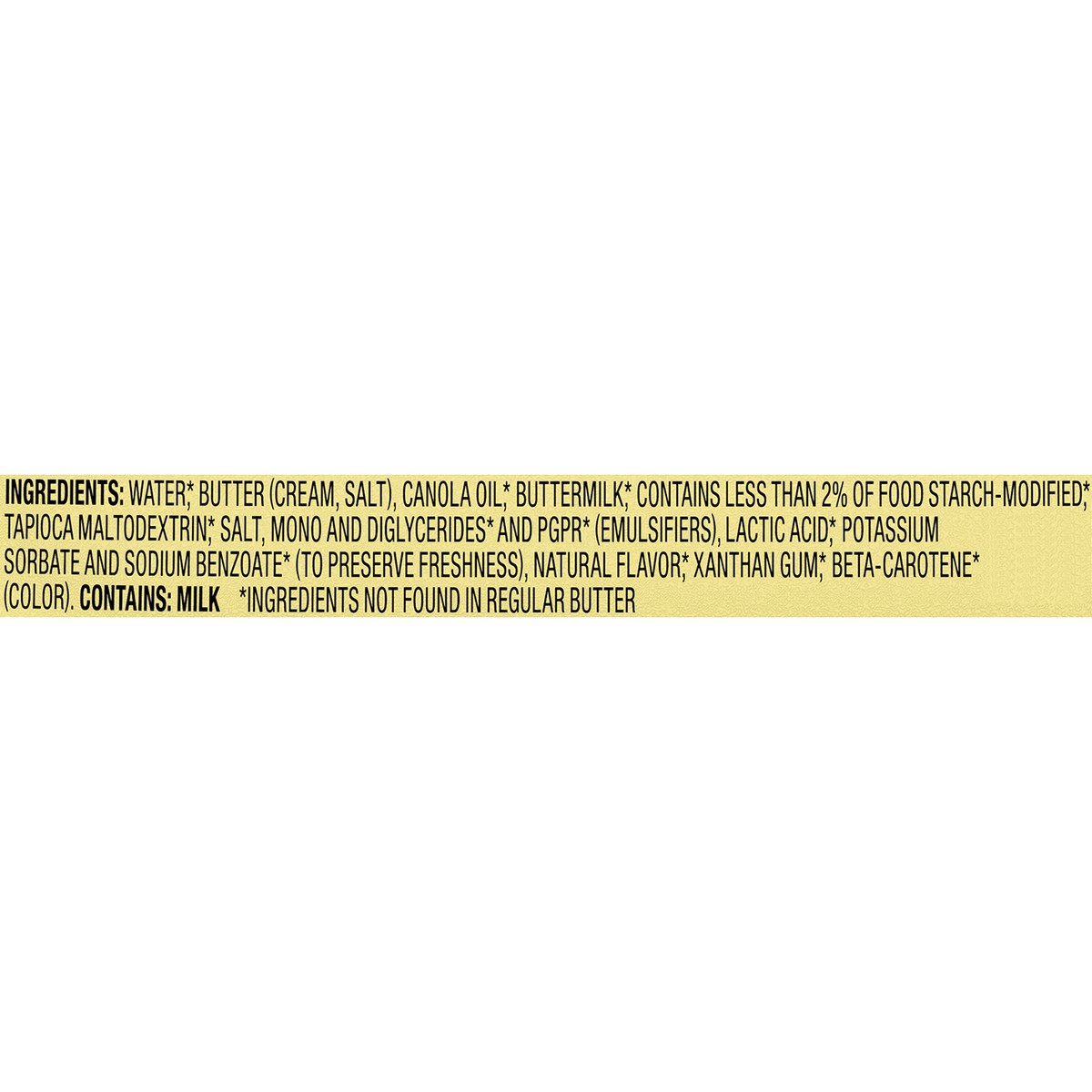 Water (Ingredients Not Found in Regular Butter), Butter (Cream, Salt), Canola Oil (Ingredients Not Found in Regular Butter) Buttermilk (Ingredients Not Found in Regular Butter), Contains Less than 2% …