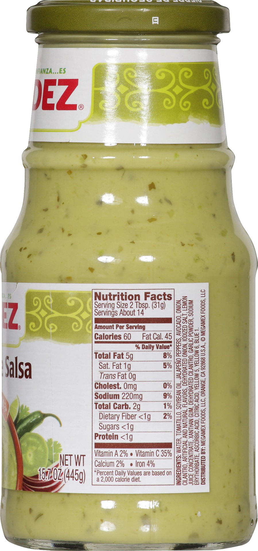 Ingredients: Water, Tomatillos, Soybean Oil with TBHQ (Antioxidant), Green Chile Peppers, Onions, Avocados, Cilantro, Seasoning Blend (Maltodextrin, Iodized Salt, Natural and Artificial Flavors, Citri…