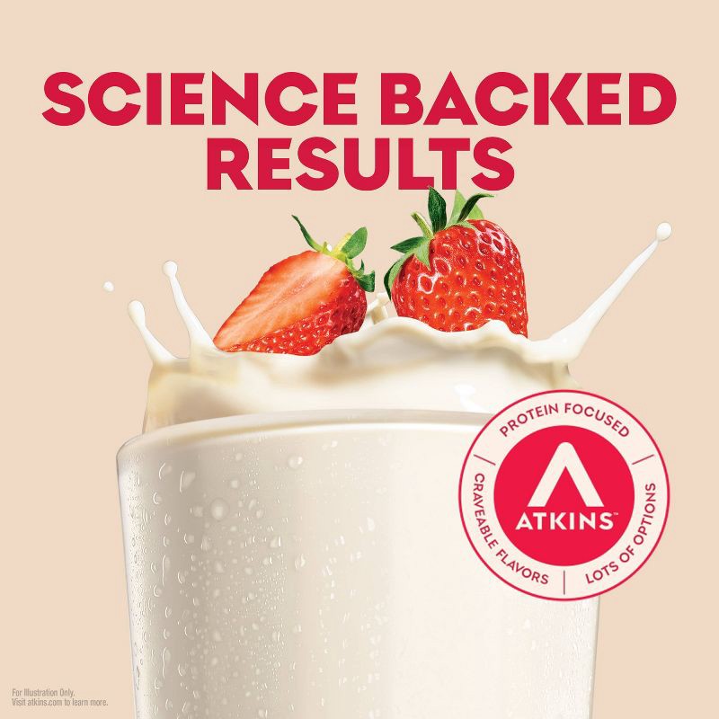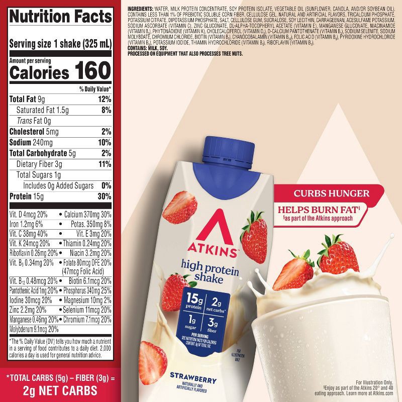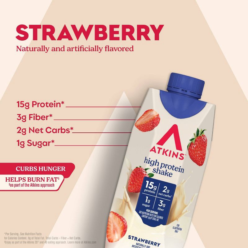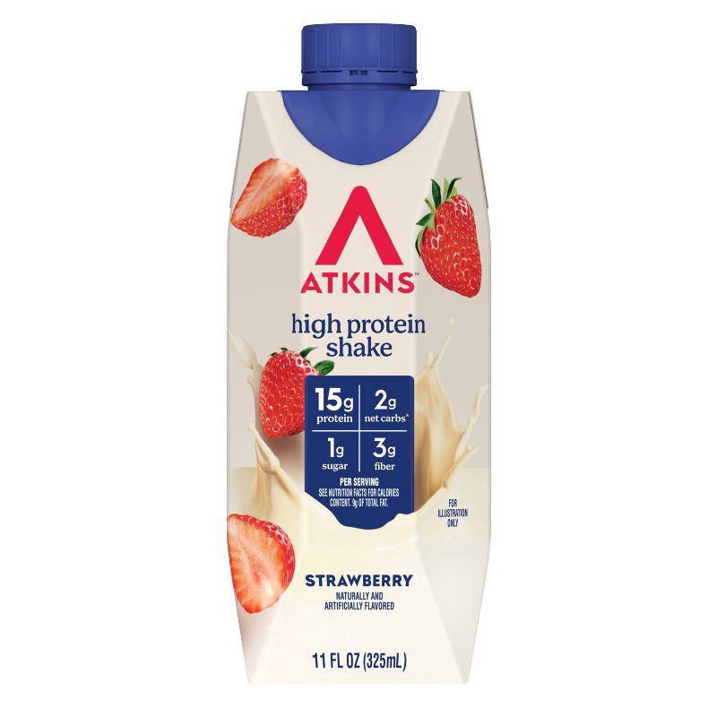 - AT HOME OR ON-THE-GO. Atkins Strawberry Protein Shakes. Enjoy delicious shakes that fit right into your busy schedule,With 15g of protein, 2g of net carbs, and 1g of sugar per serving*. This is Today's Atkins™.