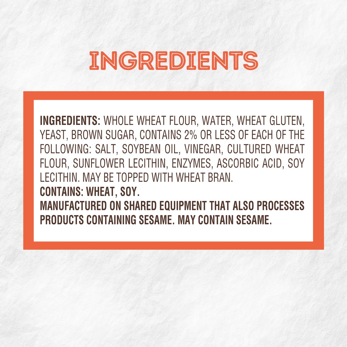 Whole Wheat Flour, Water, Wheat Gluten, Yeast, Brown Sugar, Contains 2% or Less of Each of The Following: Salt, Soybean Oil, Vinegar, Cultured Wheat Flour, Sunflower Lecithin, Enzymes, Ascorbic Acid, …
