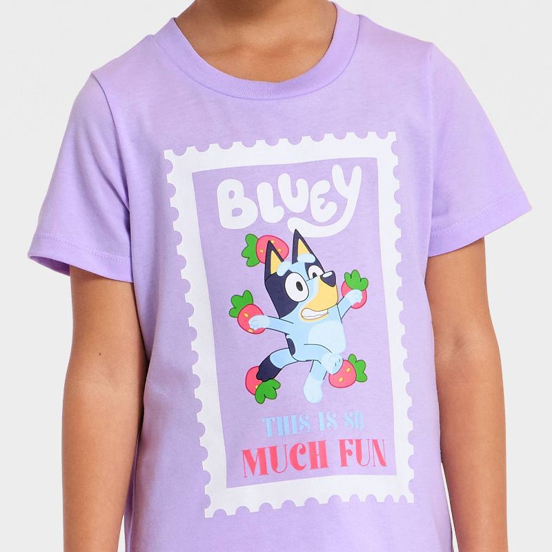 - Purple hue with stamp graphic of Bluey with strawberries plus "This Is So Much Fun"