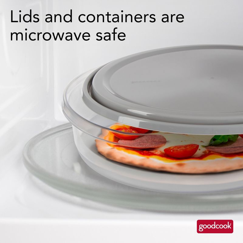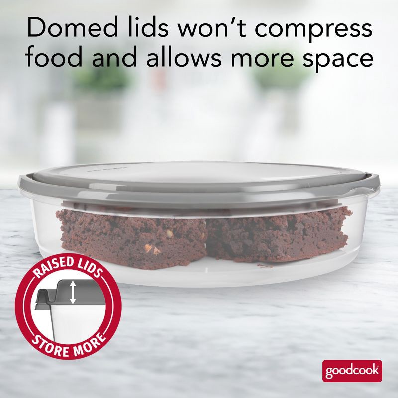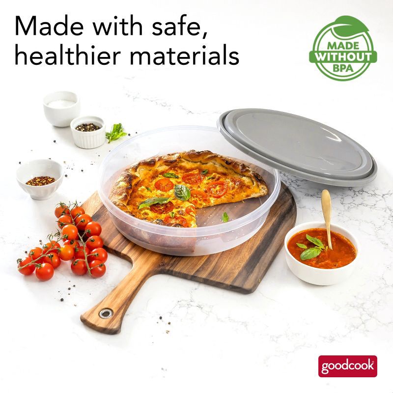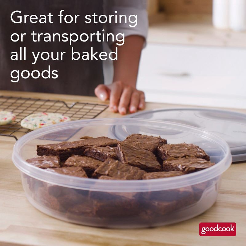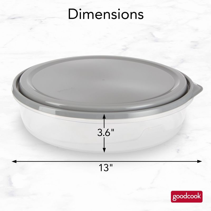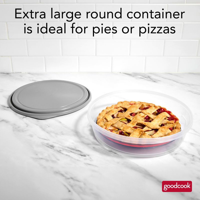 Our GoodCook EveryWare Extra Large Round Container is a full 12-inches across, large enough to hold a whole pizza or pie. The generous capacity is also great for transporting a lot of cupcakes, browni…
