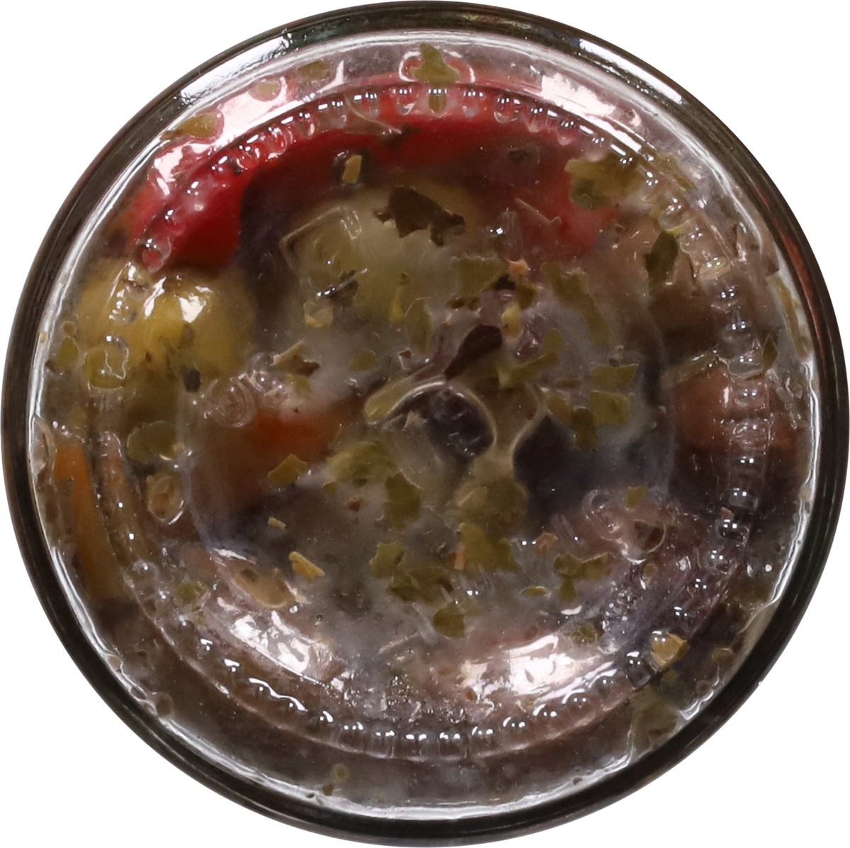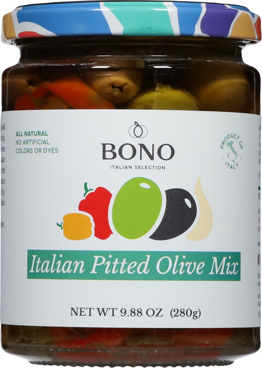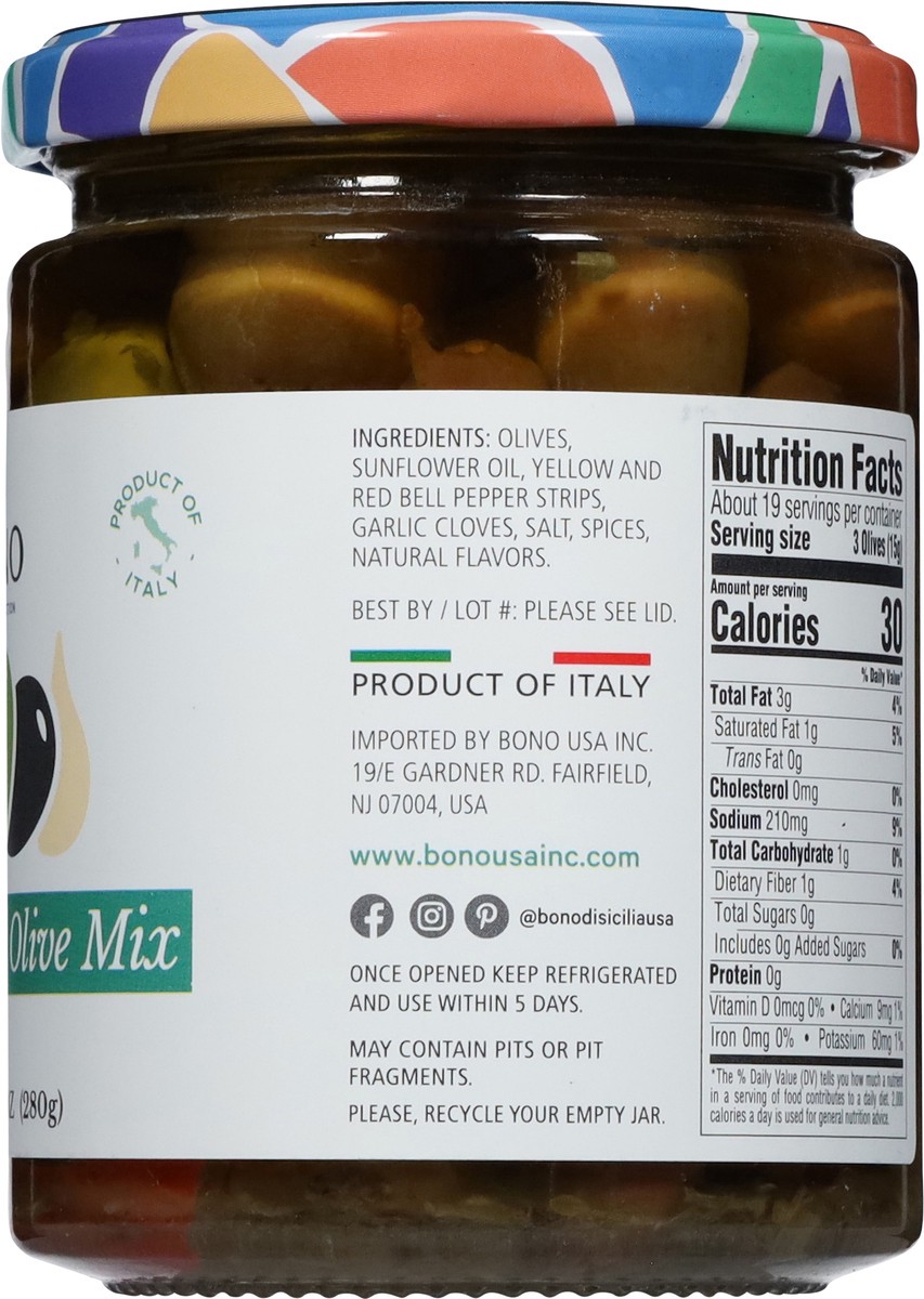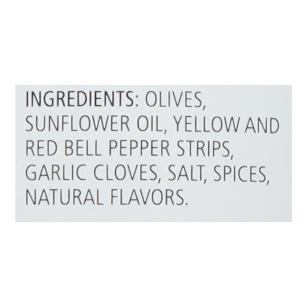 Olives, Sunflower Oil, Yellow and Red Bell Pepper Strips, Garlic Cloves, Salt, Spices, Natural Flavors.