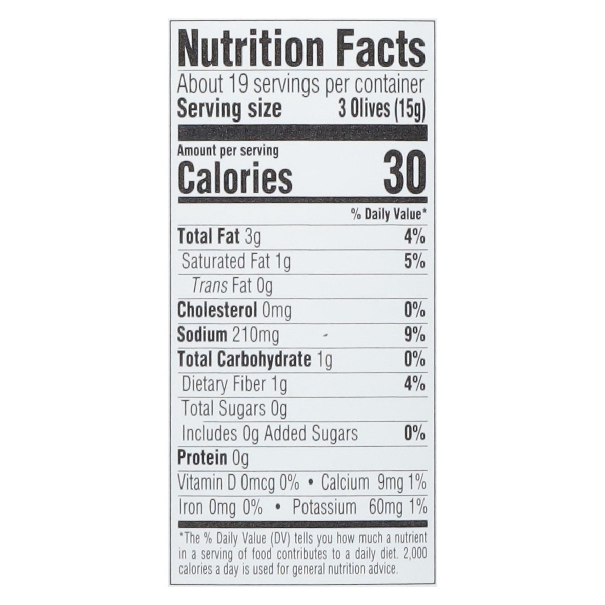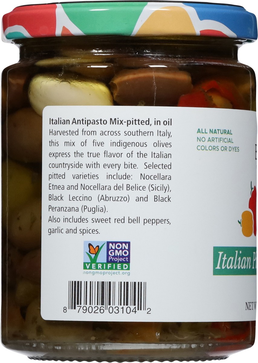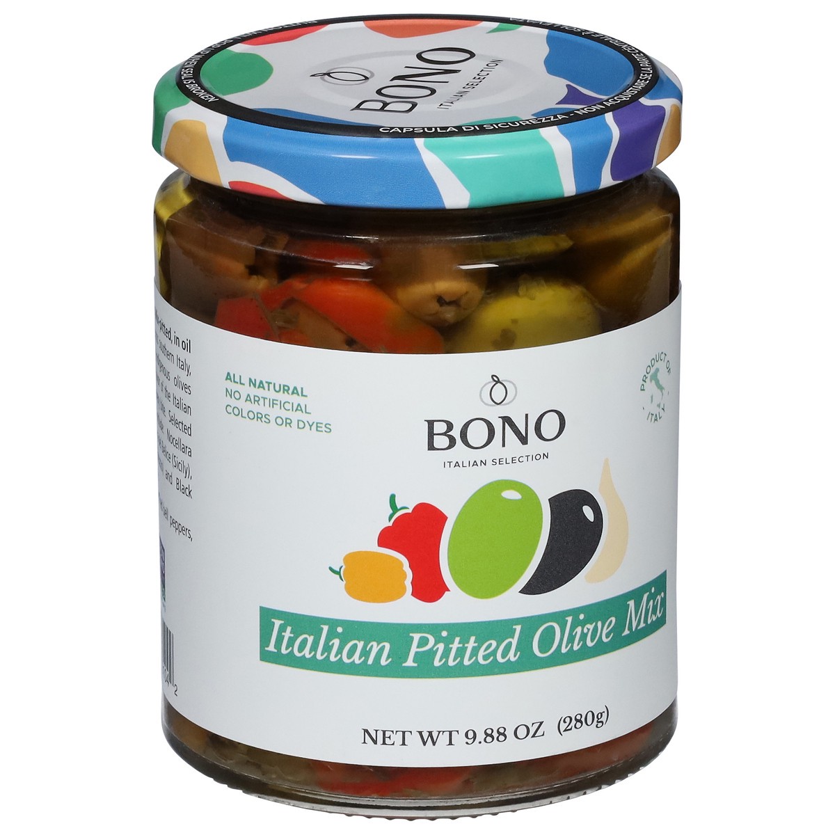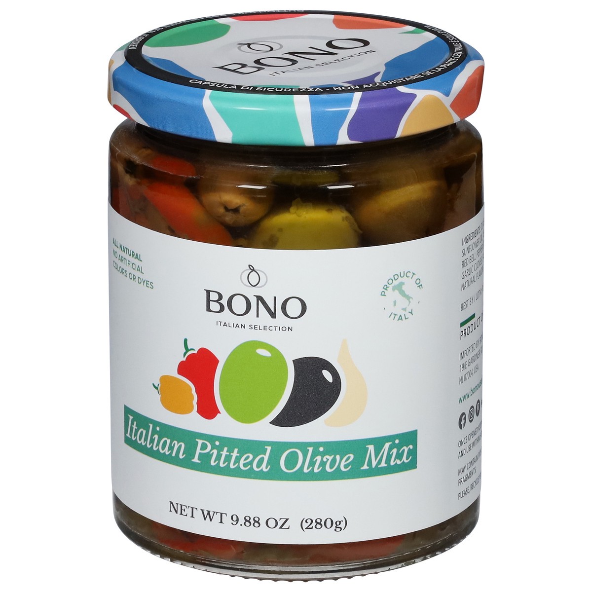 Olives, Sunflower Oil, Yellow and Red Bell Pepper Strips, Garlic Cloves, Salt, Spices, Natural Flavors.