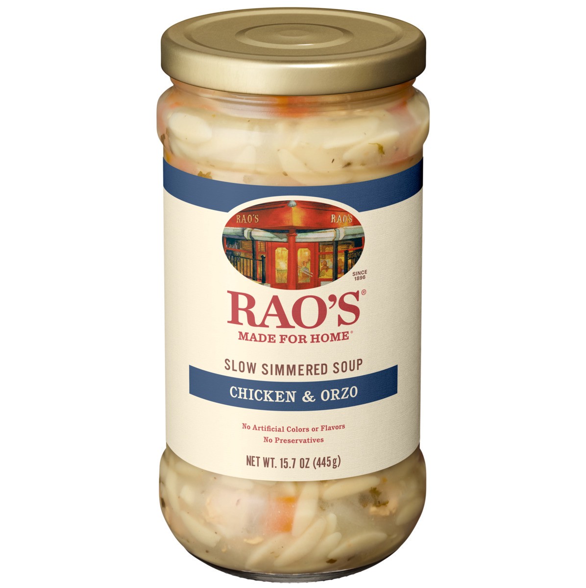 - Rao’s Made For Home Chicken & Orzo Soup starts with a savory golden chicken broth base with hearty vegetable chunks and tender chicken pieces complimented by al dente orzo