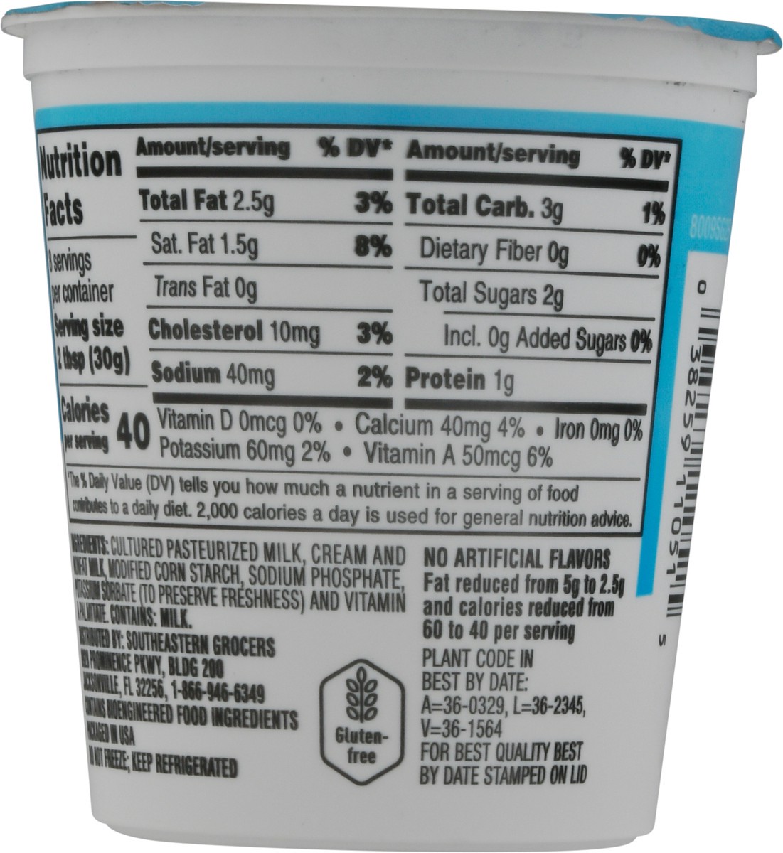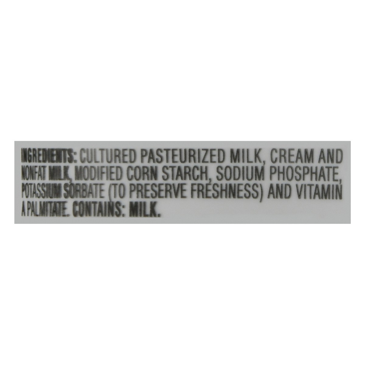 Cultured Pasteurized Milk, Cream and Nonfat Milk, Modified Corn Starch, Sodium Phosphate, Potassium Sorbate (to Preserve Freshness), and Vitamin A Palmitate.