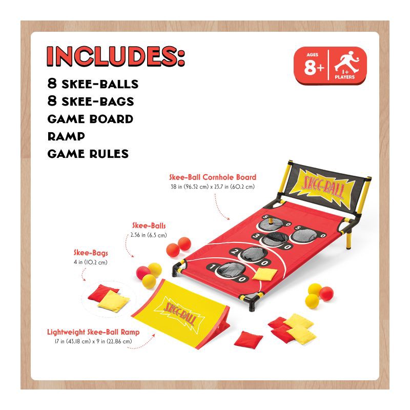 - Complete Game Set Included: Includes (8) skee-balls (2.6in), (8) skee-bags (4in x 4in), game board, ramp, and official game rules.