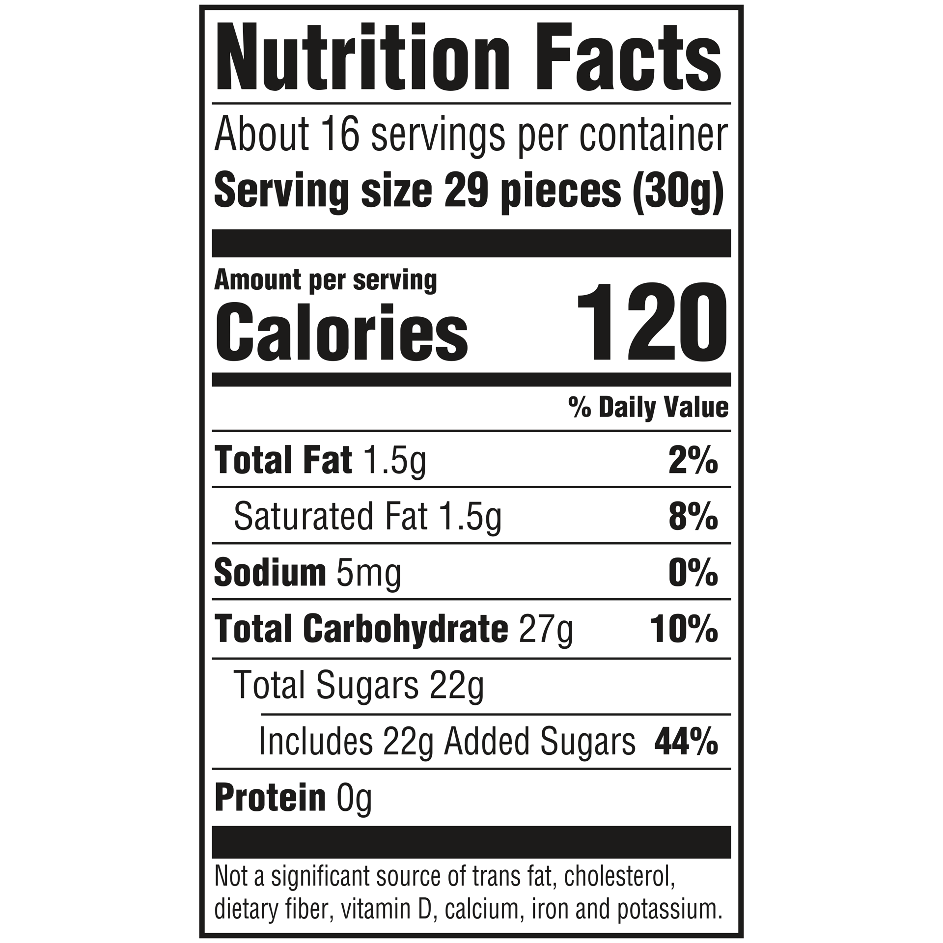 Made of: Sugar, Corn Syrup, Hydrogenated Palm Kernel Oil, Less than 2% of: Citric Acid, Tapioca Dextrin, Modified Corn Starch, Natural and Artificial Flavors, Sodium Citrate, Colors (Red 40 Lake, Blue…