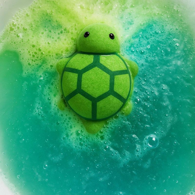 - This turtle bath fizzer bursts colors of green and blue once immersed in water