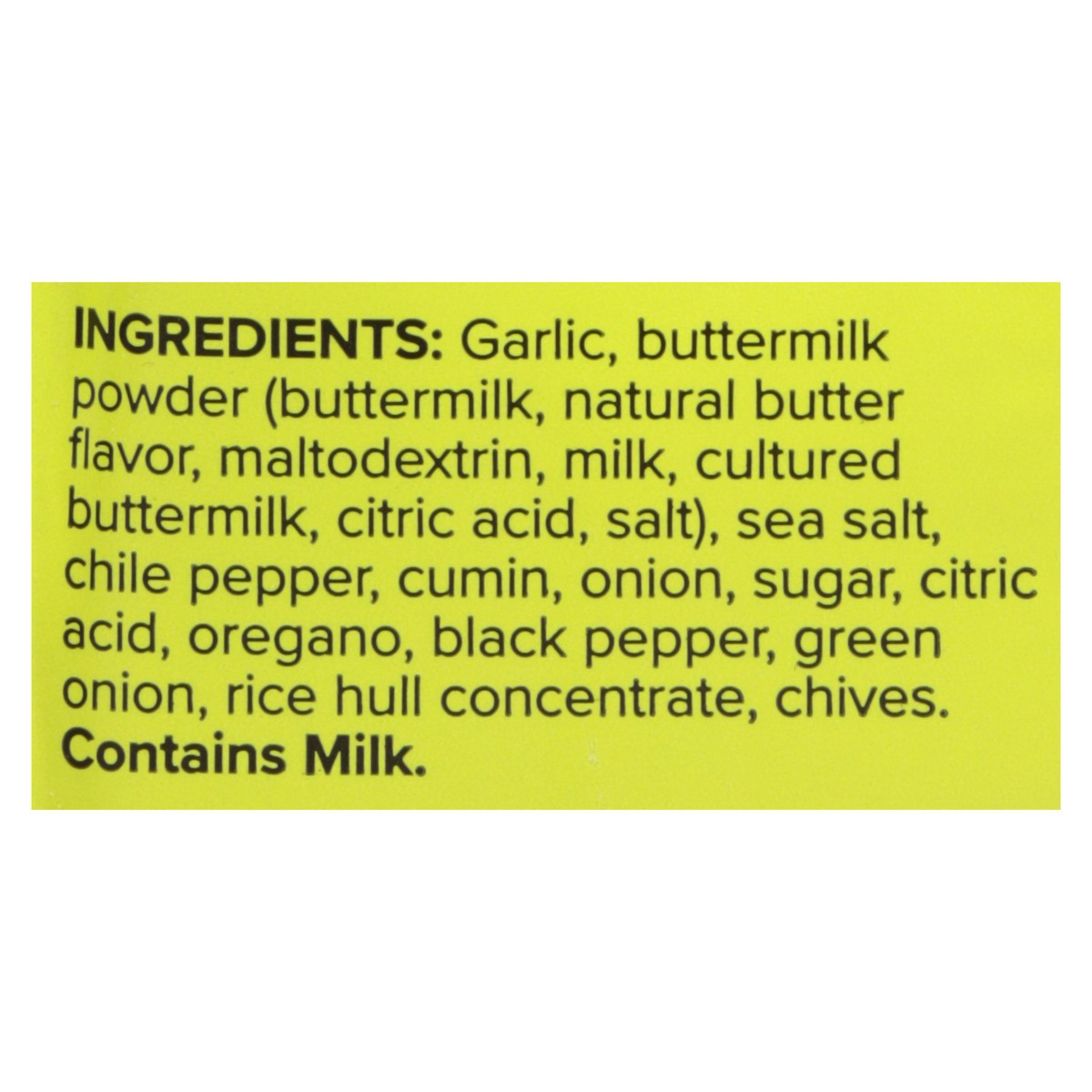 Garlic, Buttermilk Powder (Buttermilk, Natural Butter Flavor, Maltodextrin, Milk, Cultured Buttermilk, Citric Acid, Salt), Sea Salt, Chile Pepper, Cumin, Onion, Sugar, Citric Acid, Oregano, Black Pepp…
