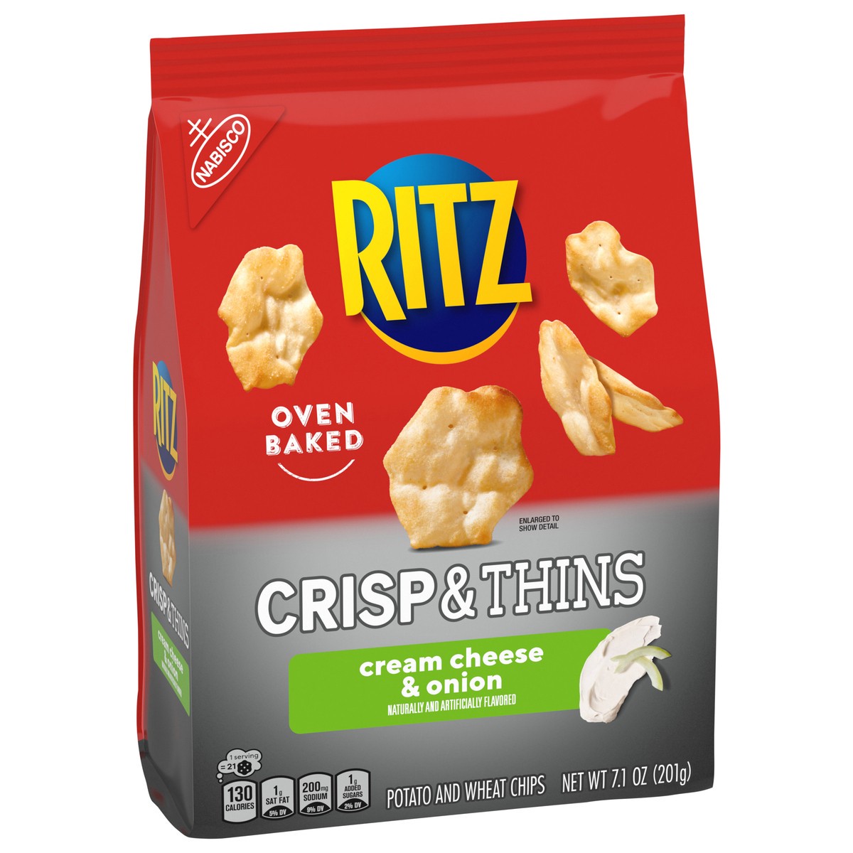 RITZ Crisp and Thins Cream Cheese and Onion Potato and Wheat Chips are light chips that are oven baked, not fried, with a crispy, thin shape and an irresistible crunch. These reduced fat chips contain…