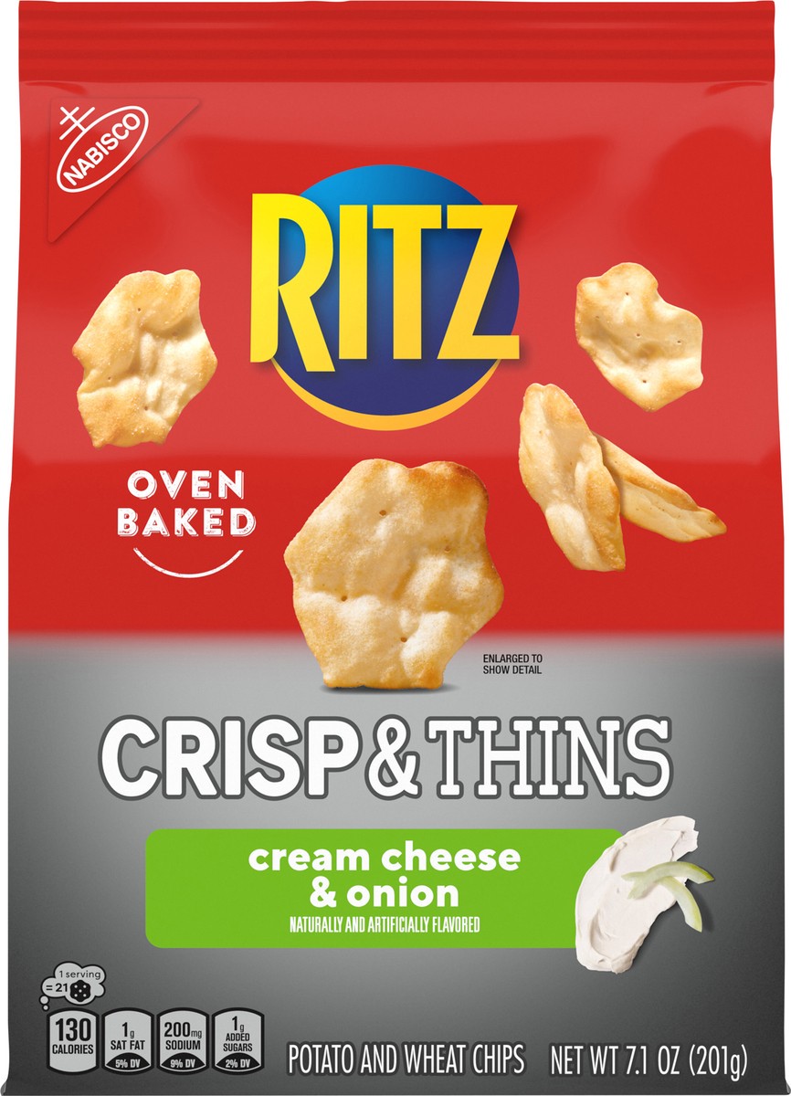 RITZ Crisp and Thins Cream Cheese and Onion Potato and Wheat Chips are light chips that are oven baked, not fried, with a crispy, thin shape and an irresistible crunch. These reduced fat chips contain…