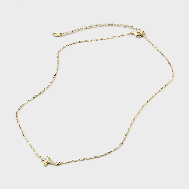 Keep your faith close with this 14k Gold-Dipped Mother Of Pearl Inlay Sideways Cross Necklace. Crafted from nickel-free metal, this gold-tone necklace features a 16-inch cable chain adorned with a sid…