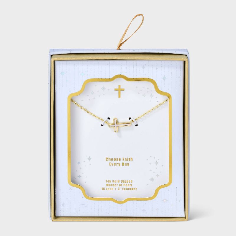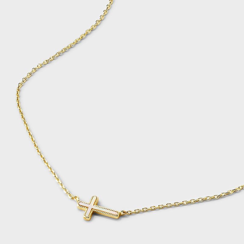14k Gold Dipped Mother Of Pearl Inlay Sideways Cross Necklace - Gold