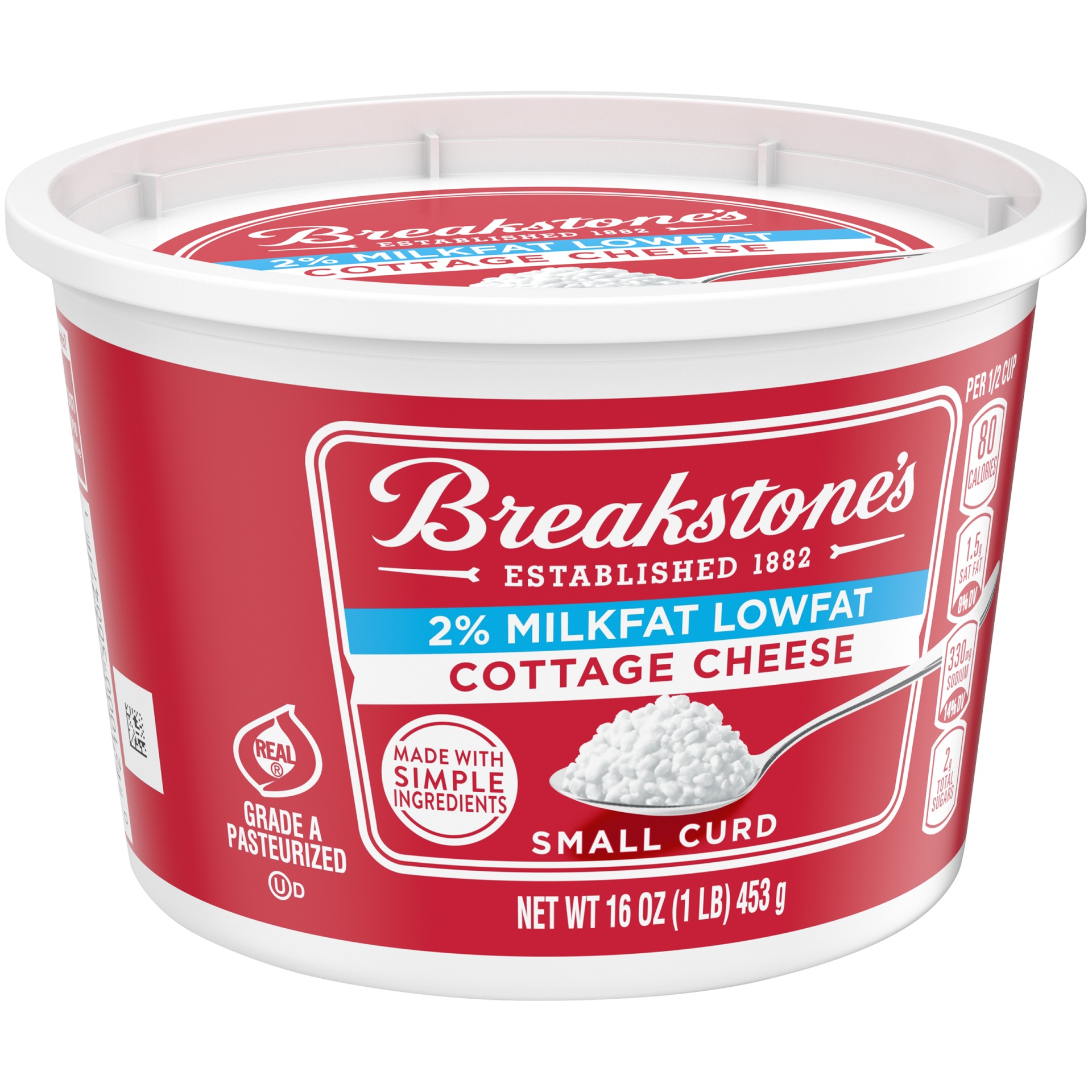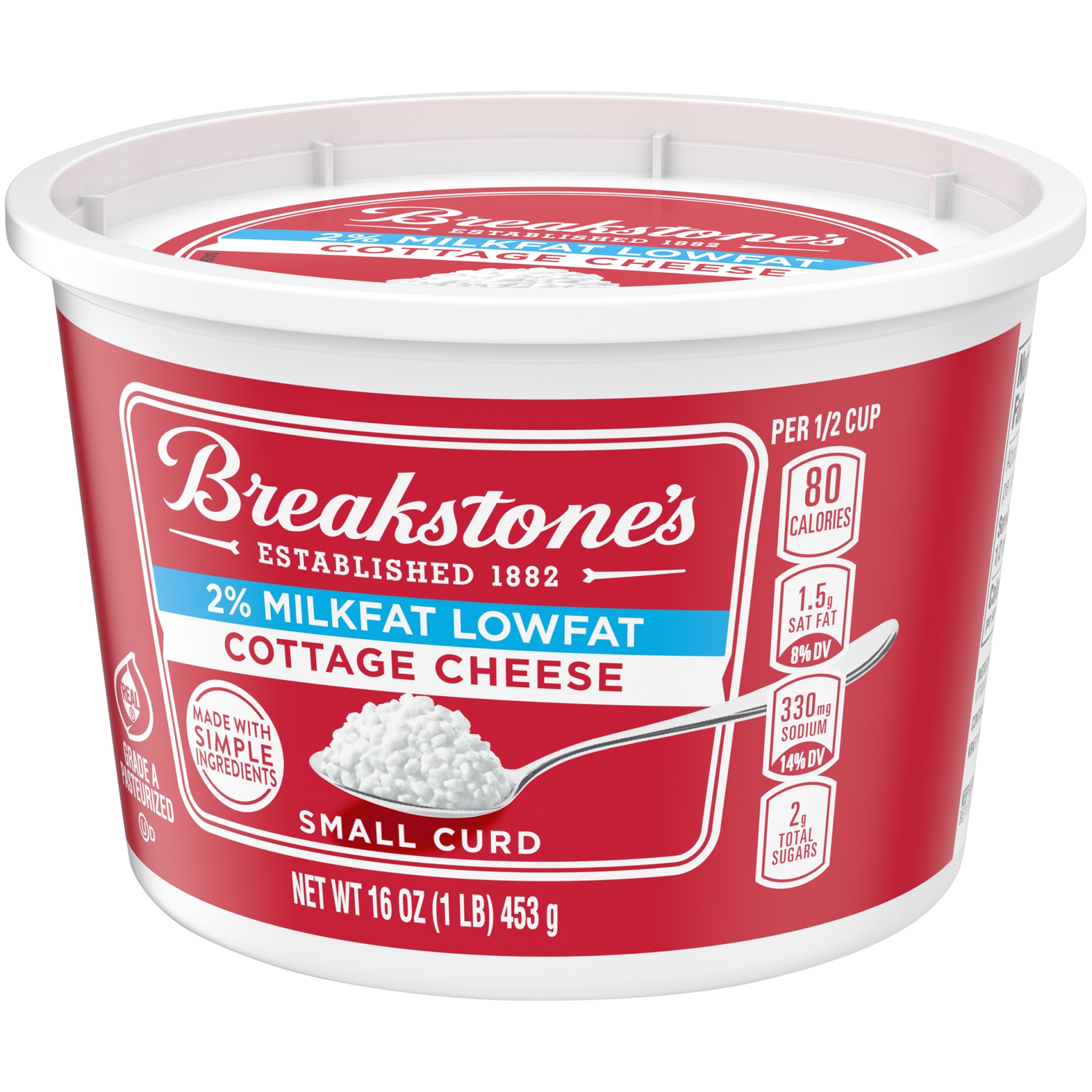 - Breakstone's Small Curd 2% Milkfat Lowfat Cottage Cheese is classic cottage cheese with less fat