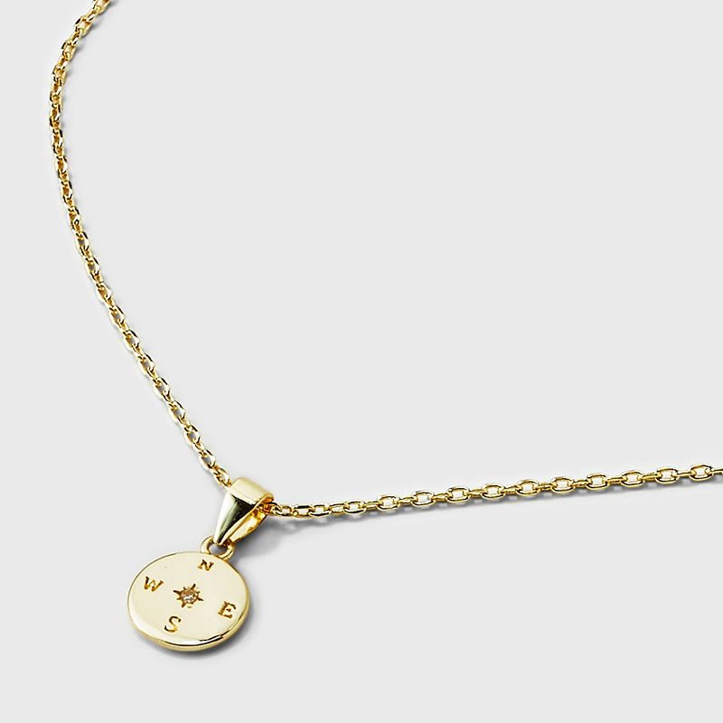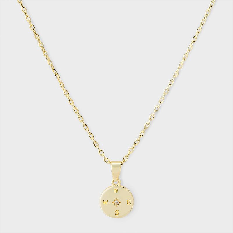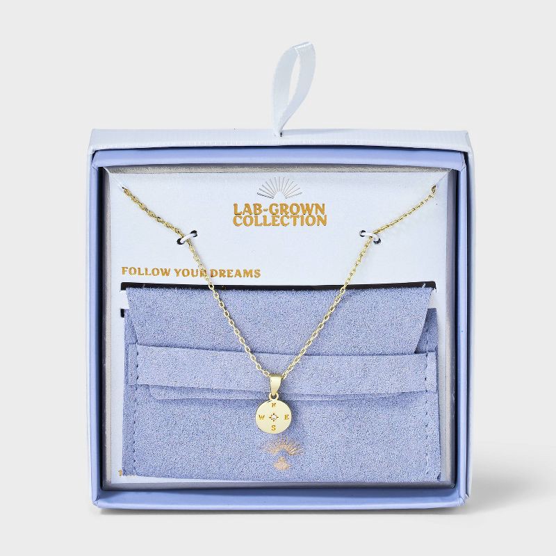 - Round compass pendant with lab-grown diamond center and engraved cardinal directions