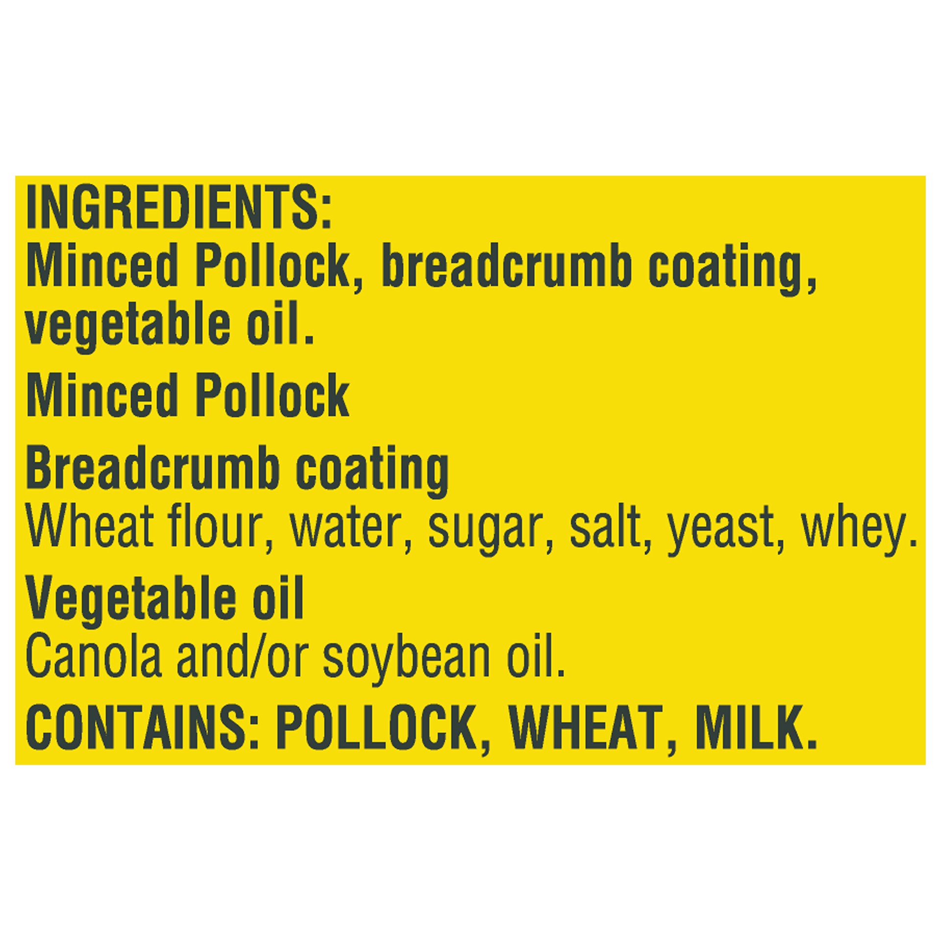 Minced Pollock, Breadcrumb Coating, Vegetable Oil. Minced Pollock. Breadcrumb Coating: Wheat Flour, Water, Sugar, Salt, Yeast, Whey. Vegetable Oil: Canola and/or Soybean Oil.