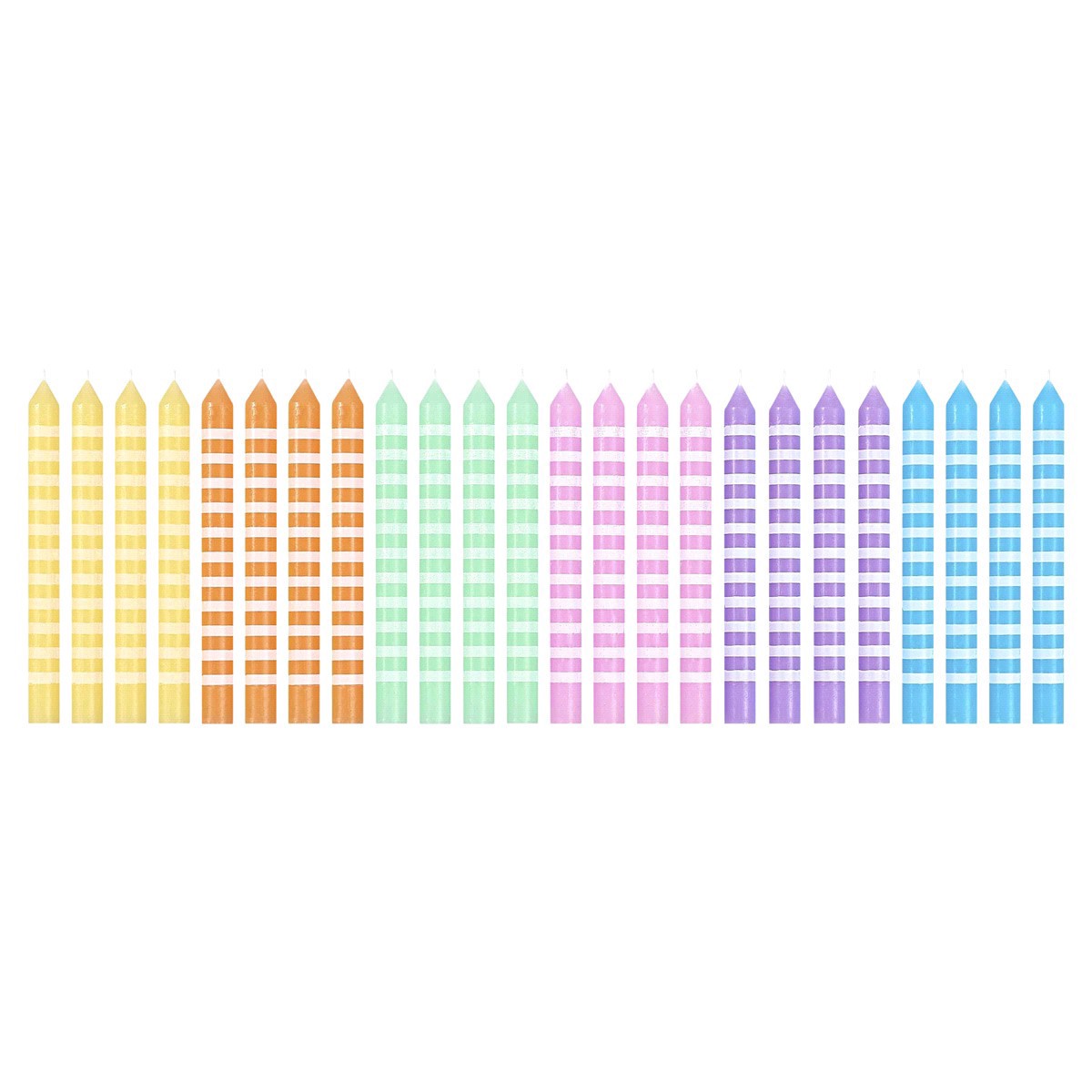 Light up any celebration with this 24-pack of pastel stripe candles from Papyrus! Multicolored candles shine in a pastel rainbow of six colors, 4 each of blue, purple, green, orange, yellow, and pink …